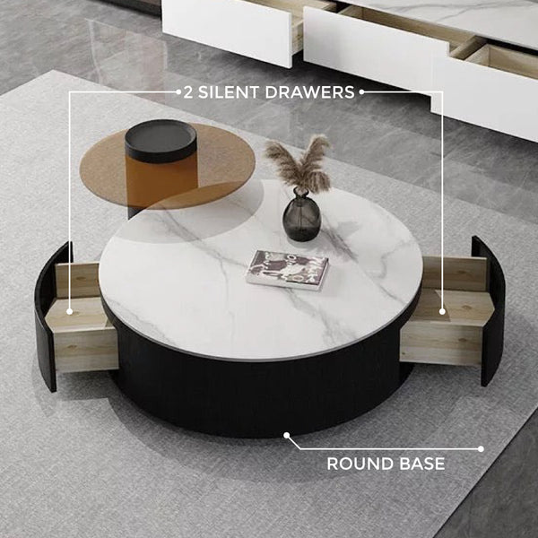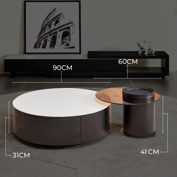 The Bahamas Round Coffee Table Set features a broad circular frame crafted from MDF, paired with a stunning round high-quality ceramic top. It includes silent wood drawers, allowing you to store your items neatly and efficiently. The side table, on the other hand, features a brown glass top, adding a retro touch to the overall design.