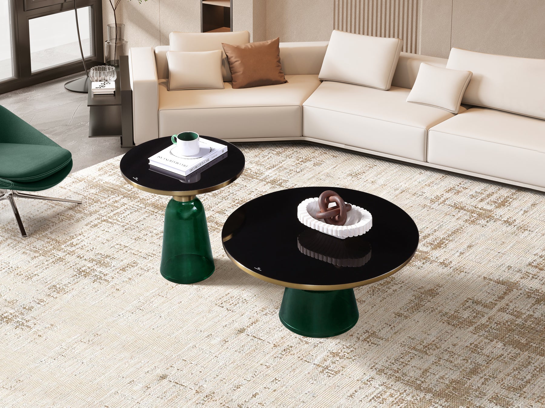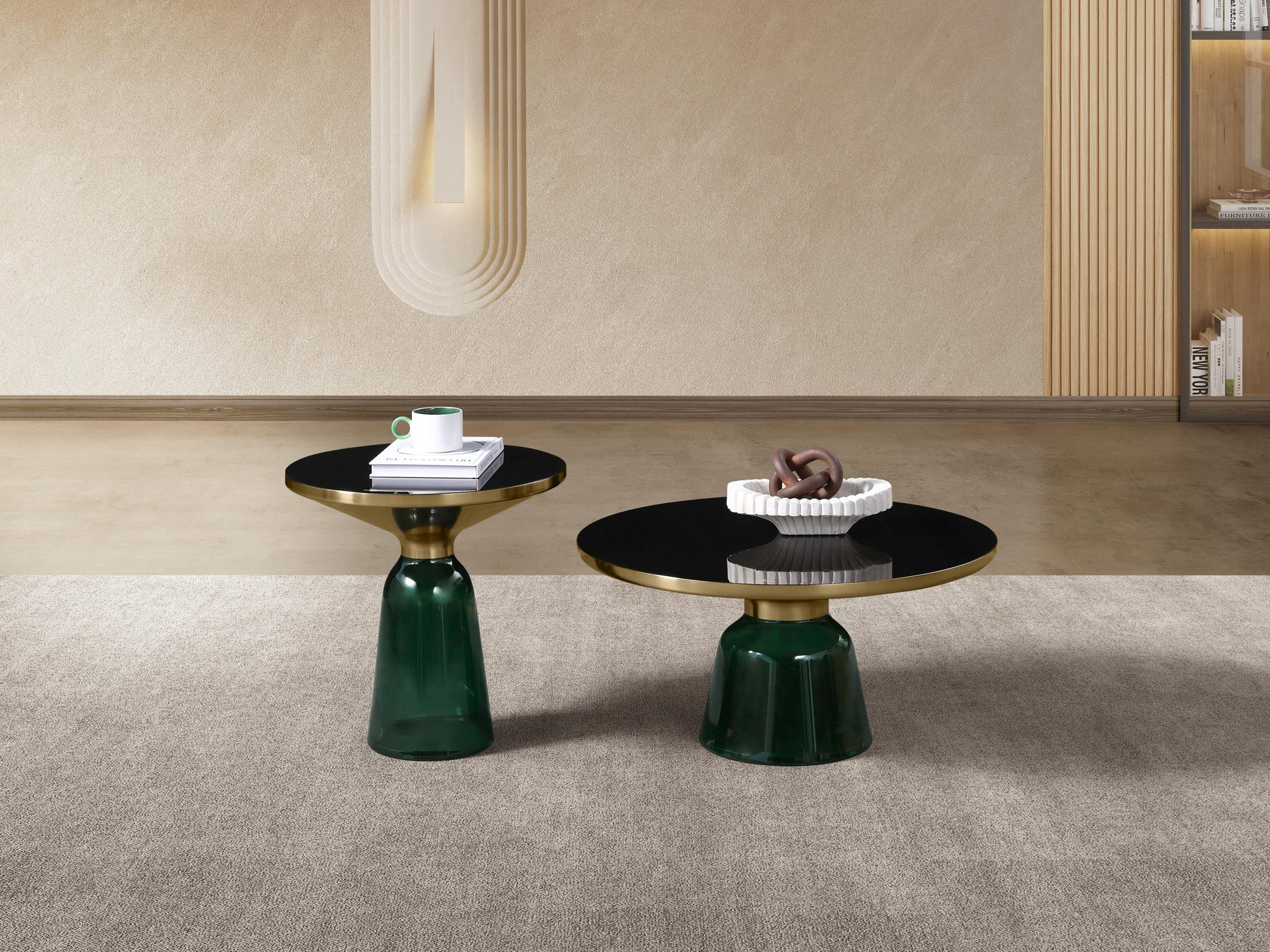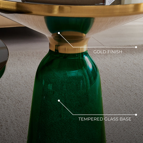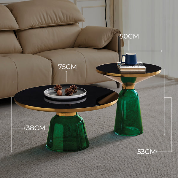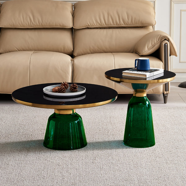 Bell Round Glass Coffee Table (GREEN) with Hand-Blown Glass Base (Set of 2)