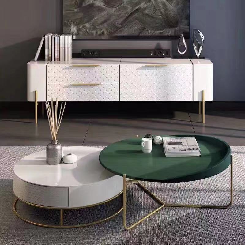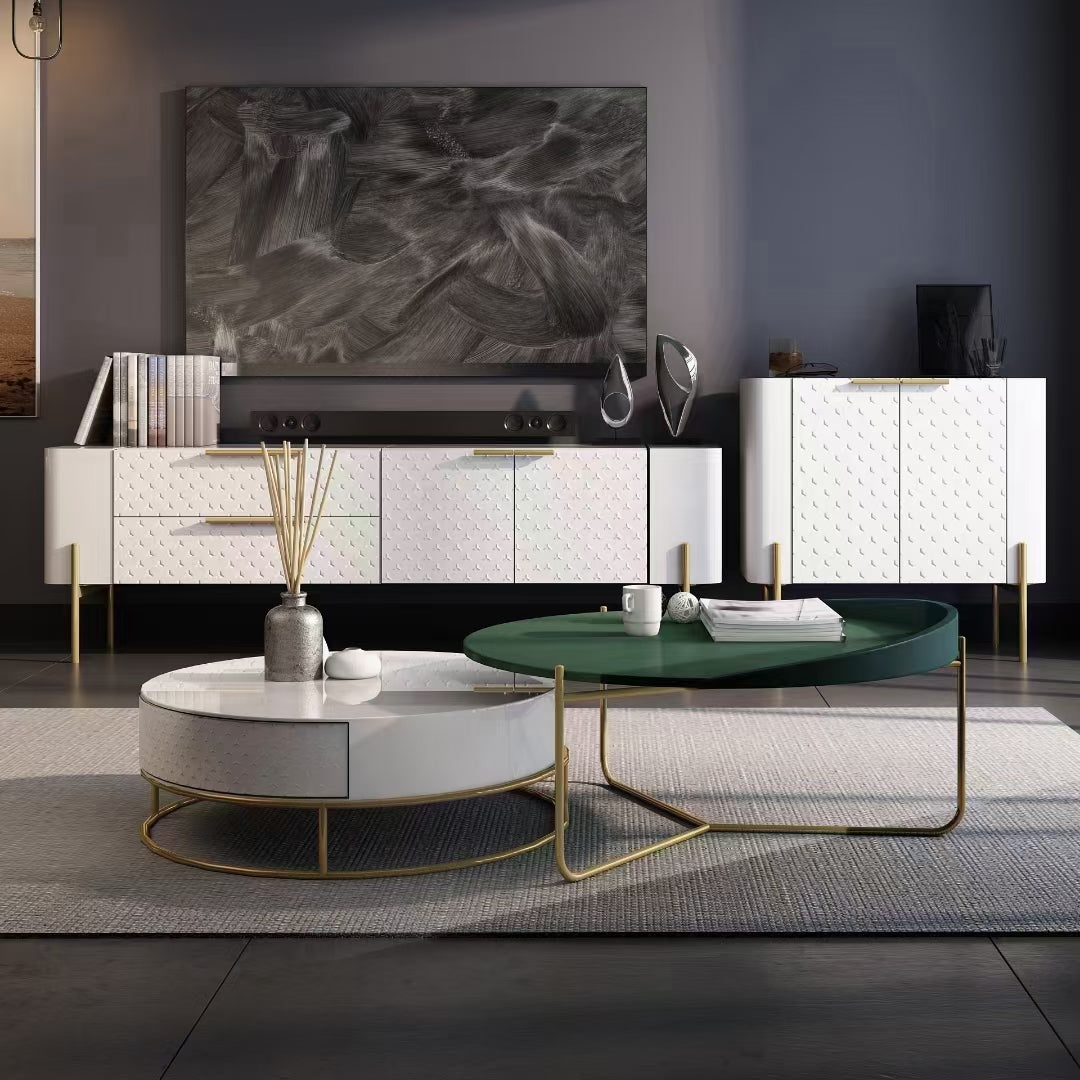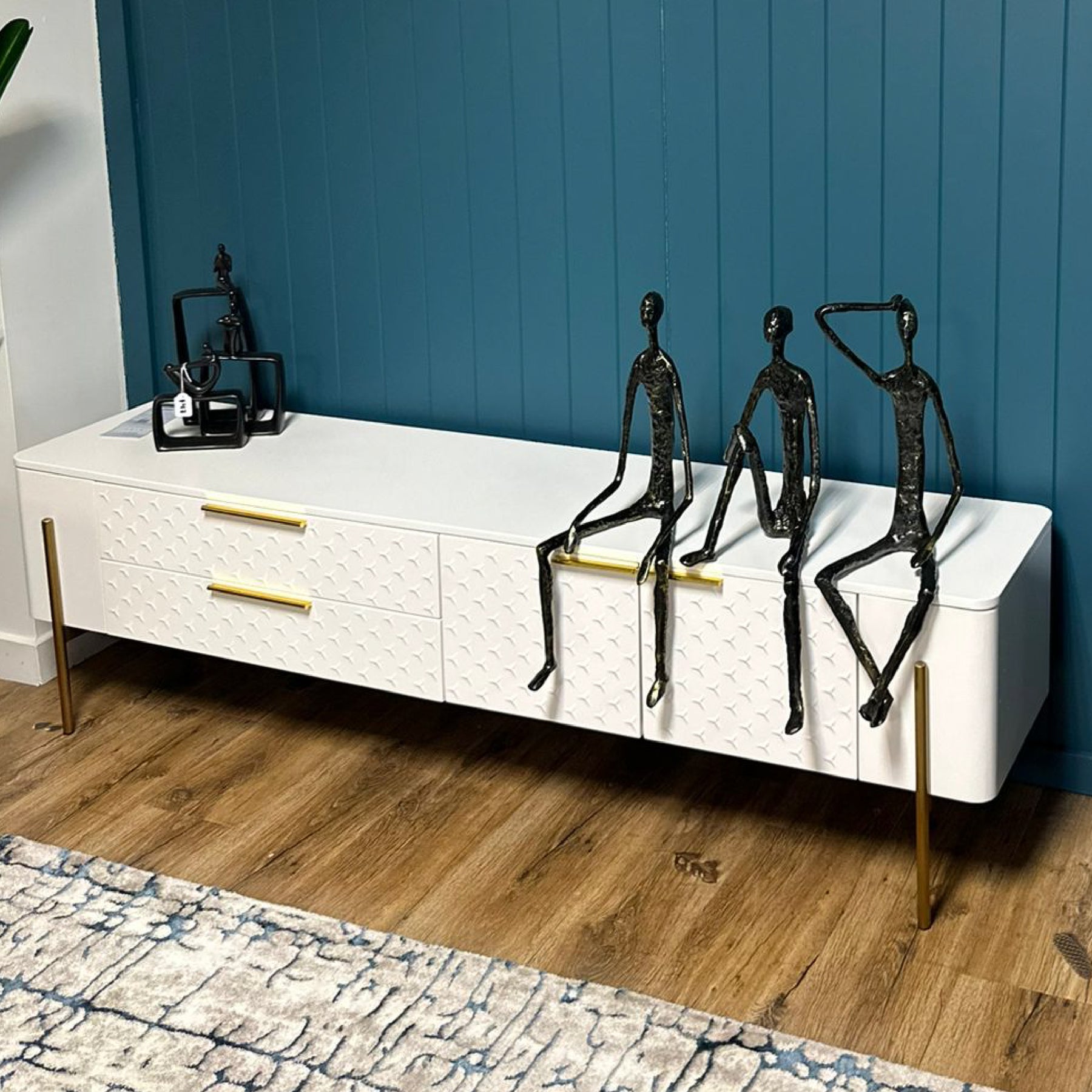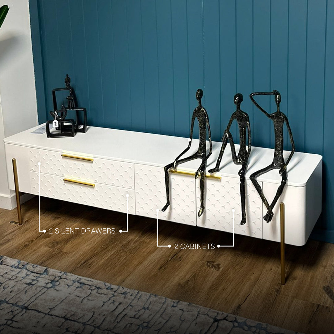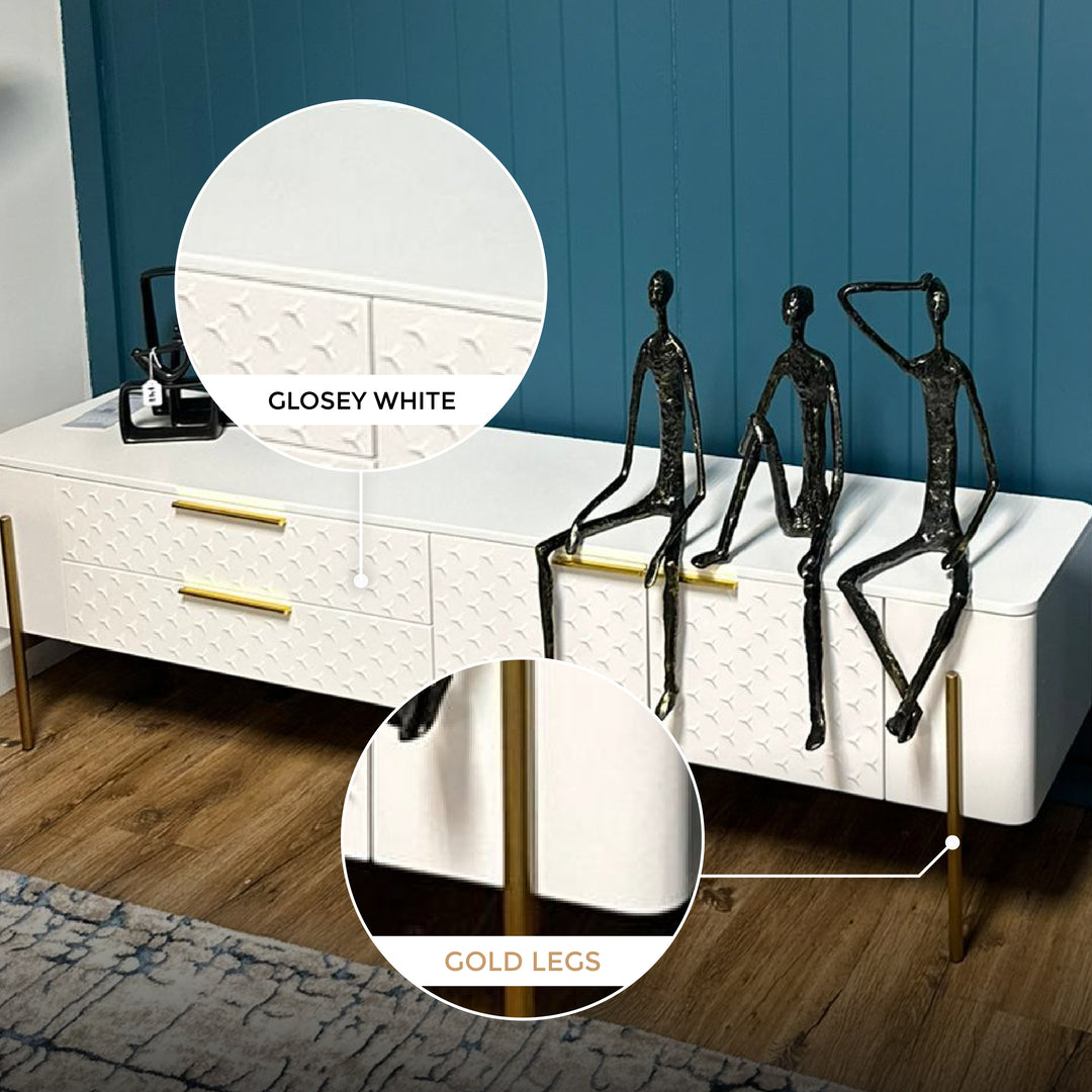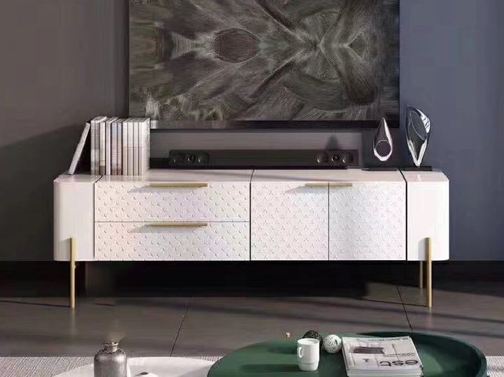 The Bravia TV Console features subtle textured patterns on the glossy white finish surface and gold accents for a graceful look. This TV cabinet stands on gold stainless steel legs in a unique fluted design. Its 2 wooden drawers and 2 cabinets offer ample storage for media devices, helping keep your living room clutter-free.