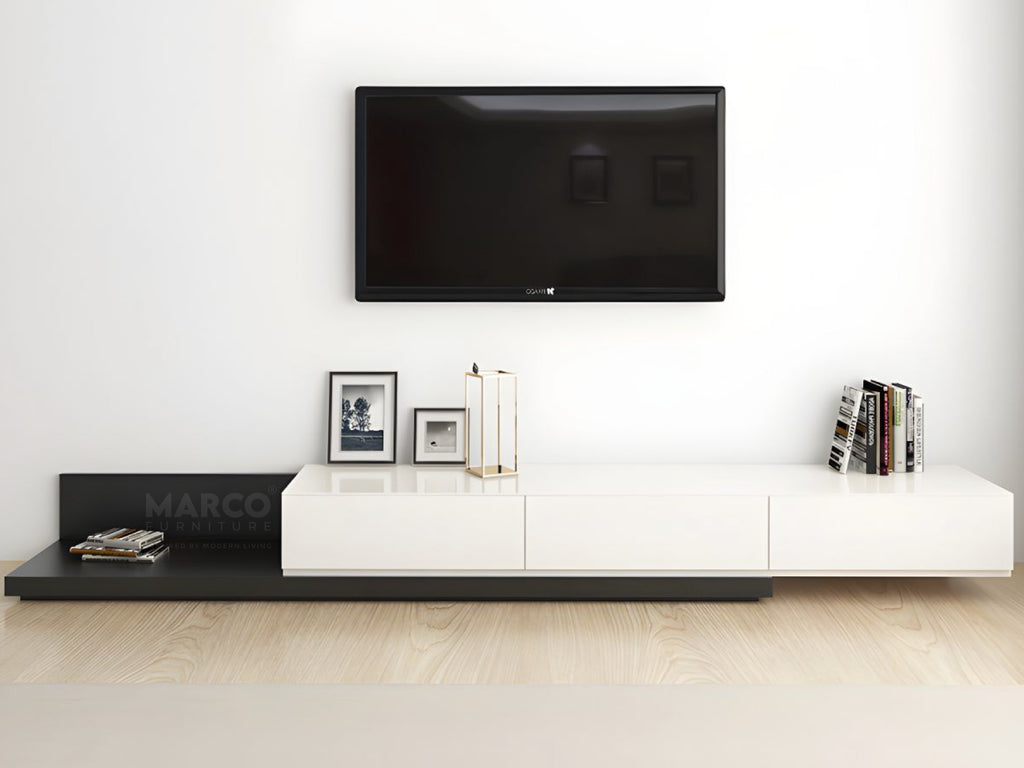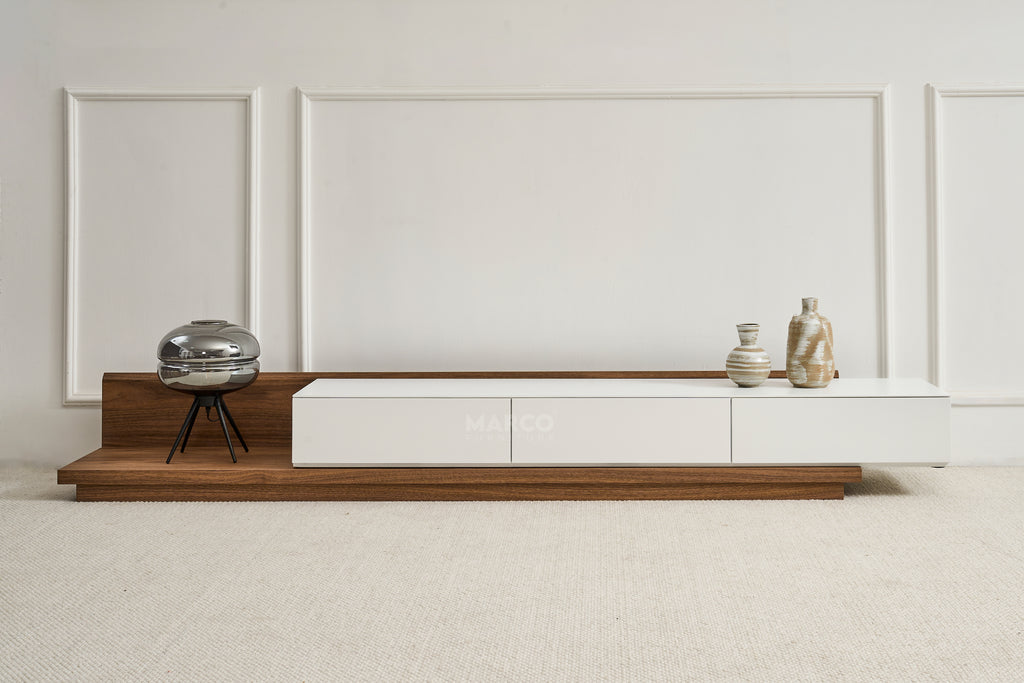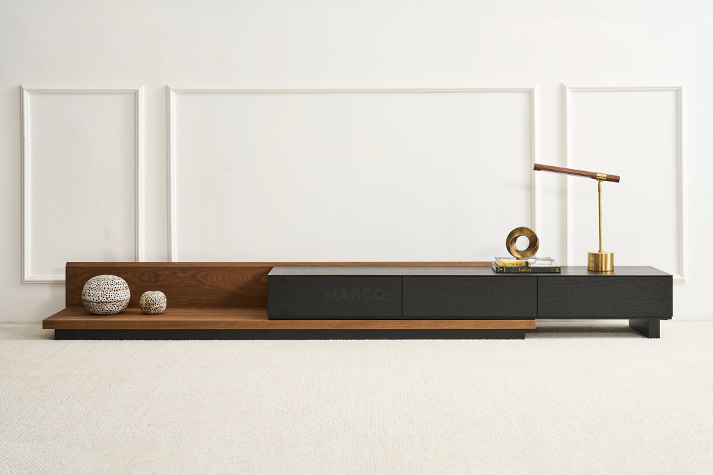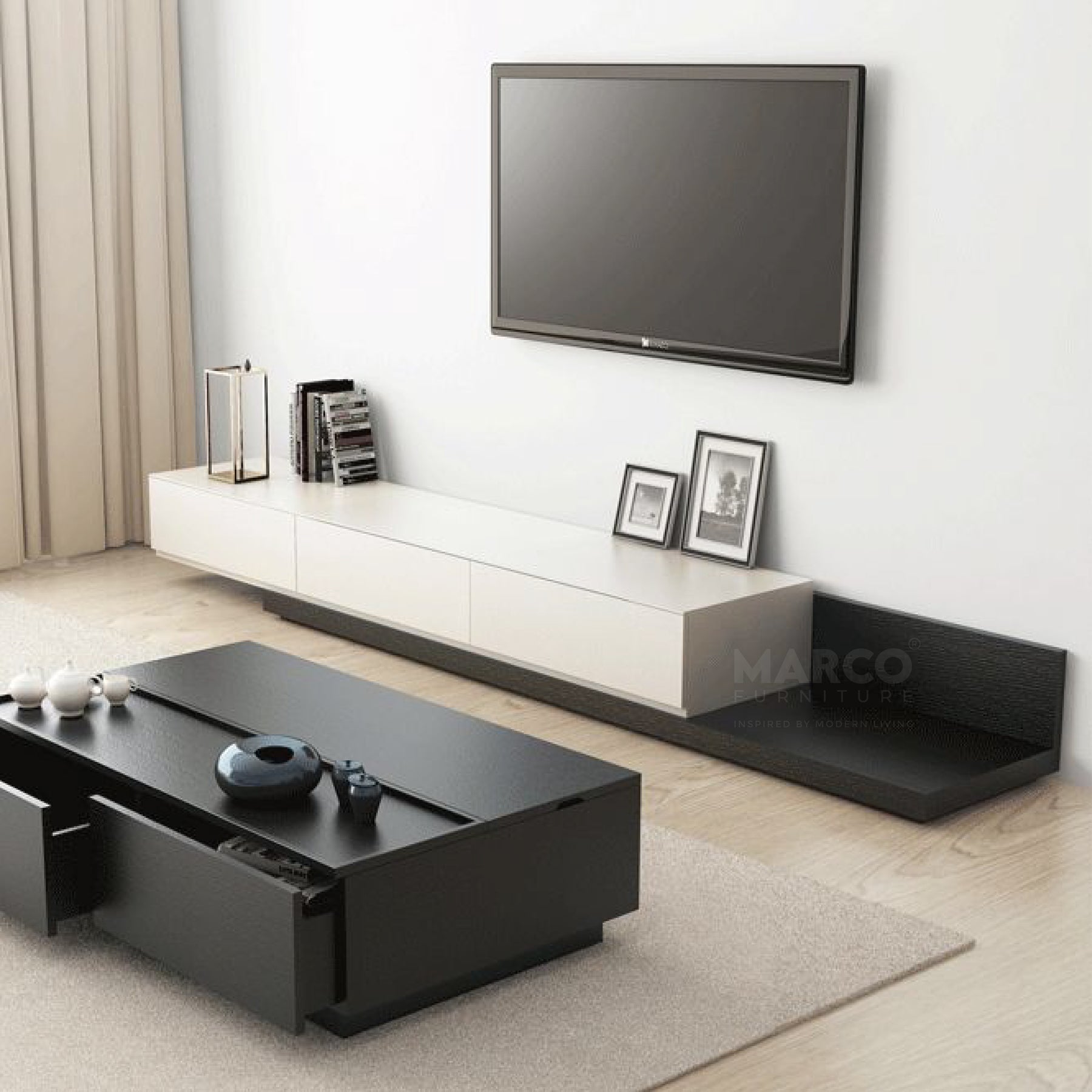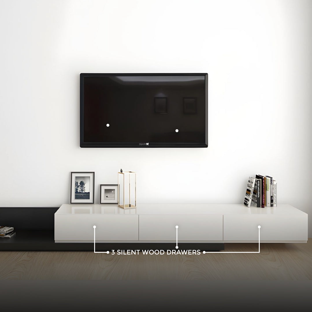 The Casper Extendable Modern TV Stand is a perfect centerpiece for your living room. This modern-inspired piece features an extendable design, allowing it to accommodate extra-large TV screens with ease. The sliding extendable top, finished in glossy white paint, pairs perfectly with the black oak veneer base. The 3 solid wood drawers offer ample storage to keep your media essentials organized and your space tidy.