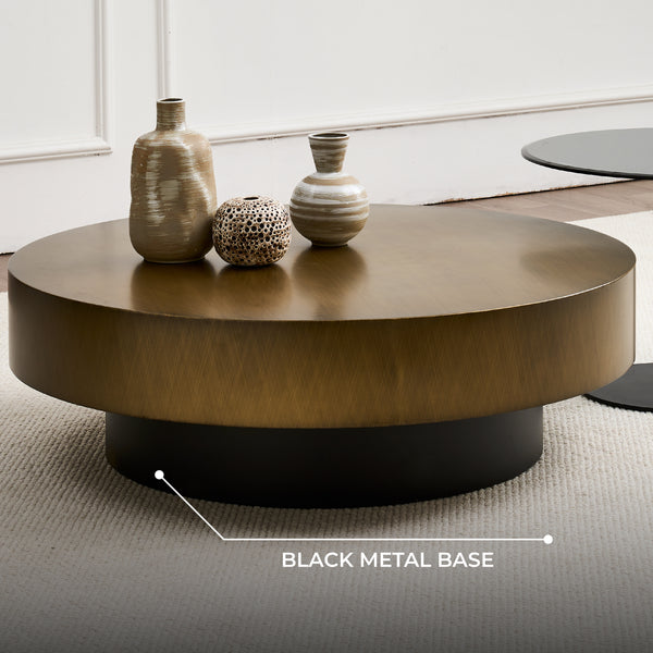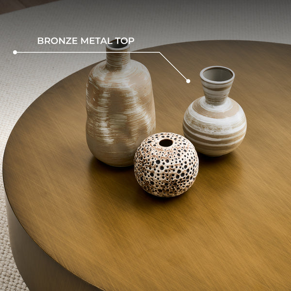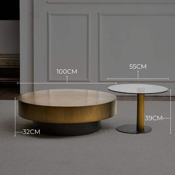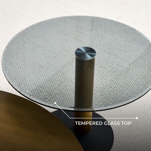The Cassidy Nesting Coffee Table Set features a broad cylindrical metal base in black finish and a bronze metallic table top. It comes with a smaller tempered glass top side table with a bronze stand and black metal baseplate. This Cassidy Coffee Table Set is an accent piece for any living space.