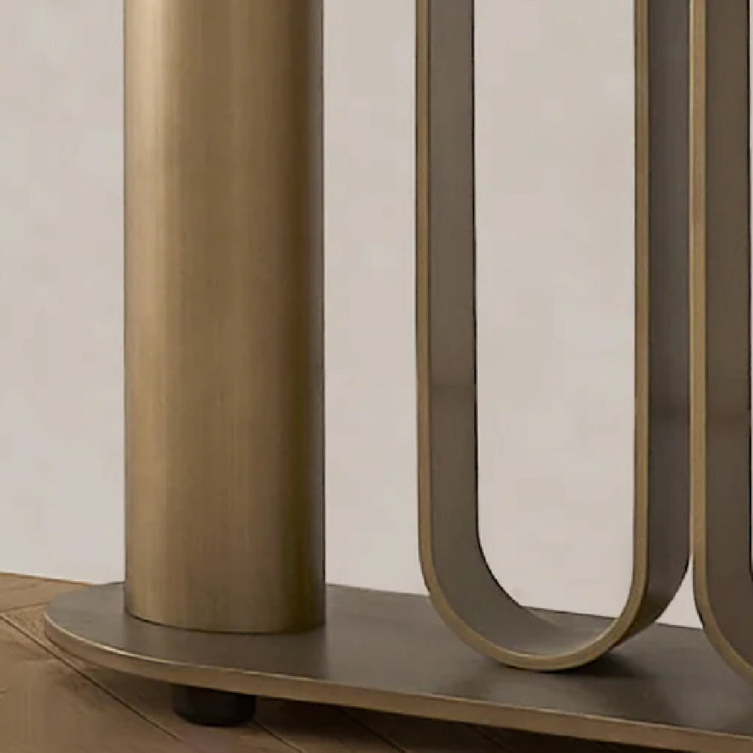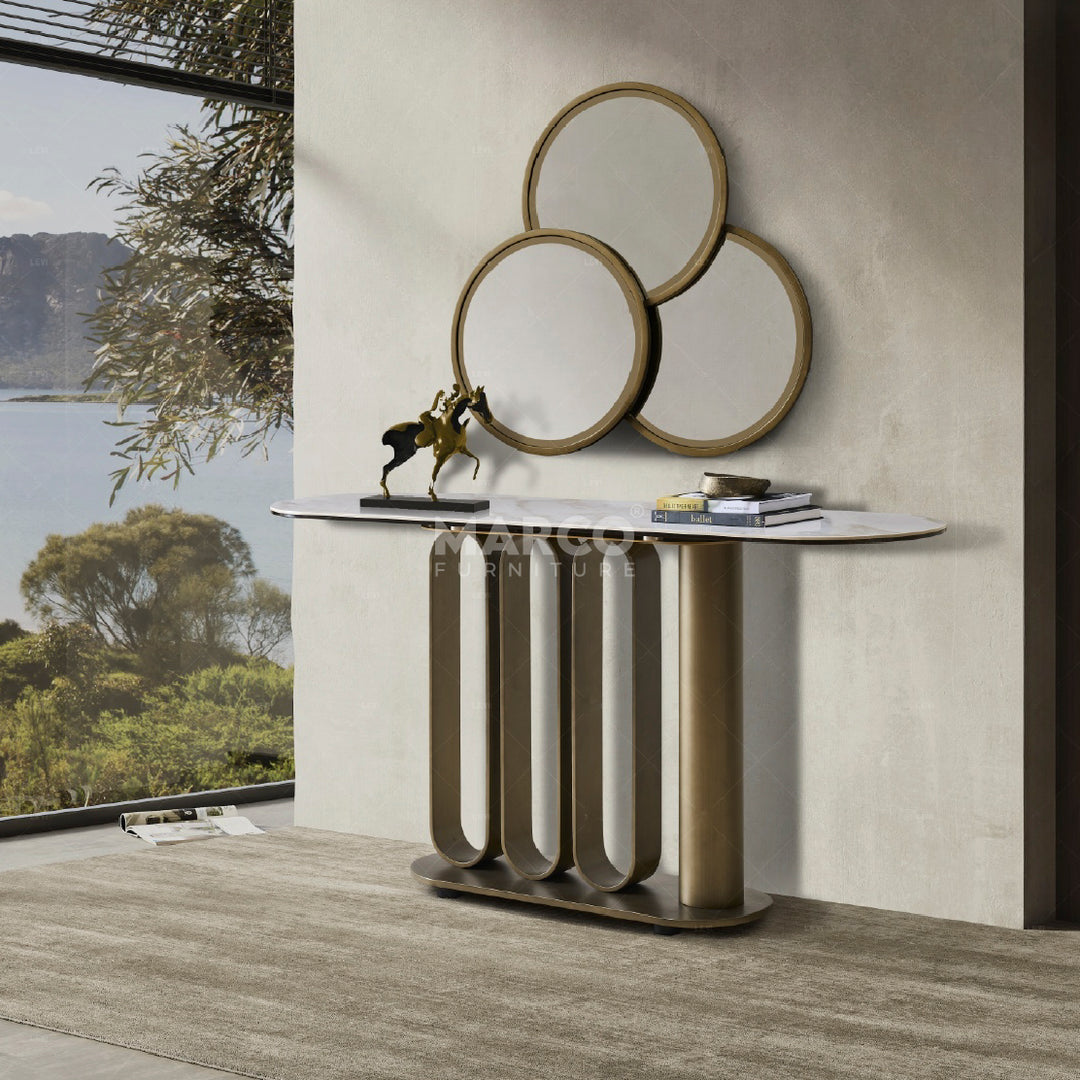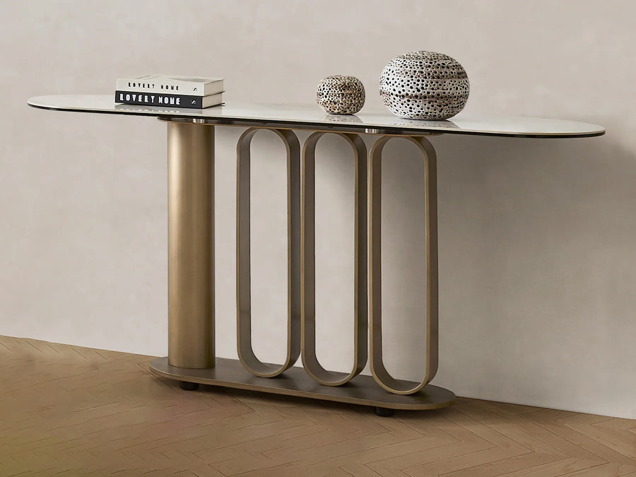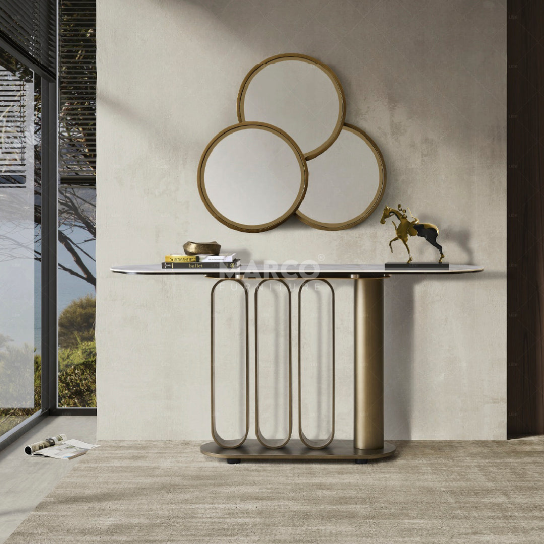 The Catalina Sintered Stone Console Table, with its stylized elements - colour, design, and texture - is a stunning addition to any living room. The royal tabletop of this hallway table features Carrara Sintered Stone and combined glass, exuding luxury at its finest. Paired with powder-coated metal base in gold, this narrow console table becomes a powerful sculptural expression.