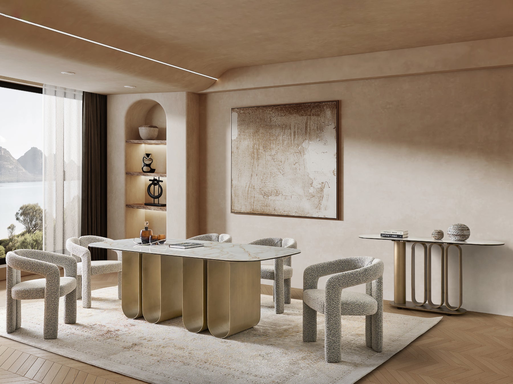 - Tabletop Material: 6mm Carrara Sintered Stone combined with 5mm glass