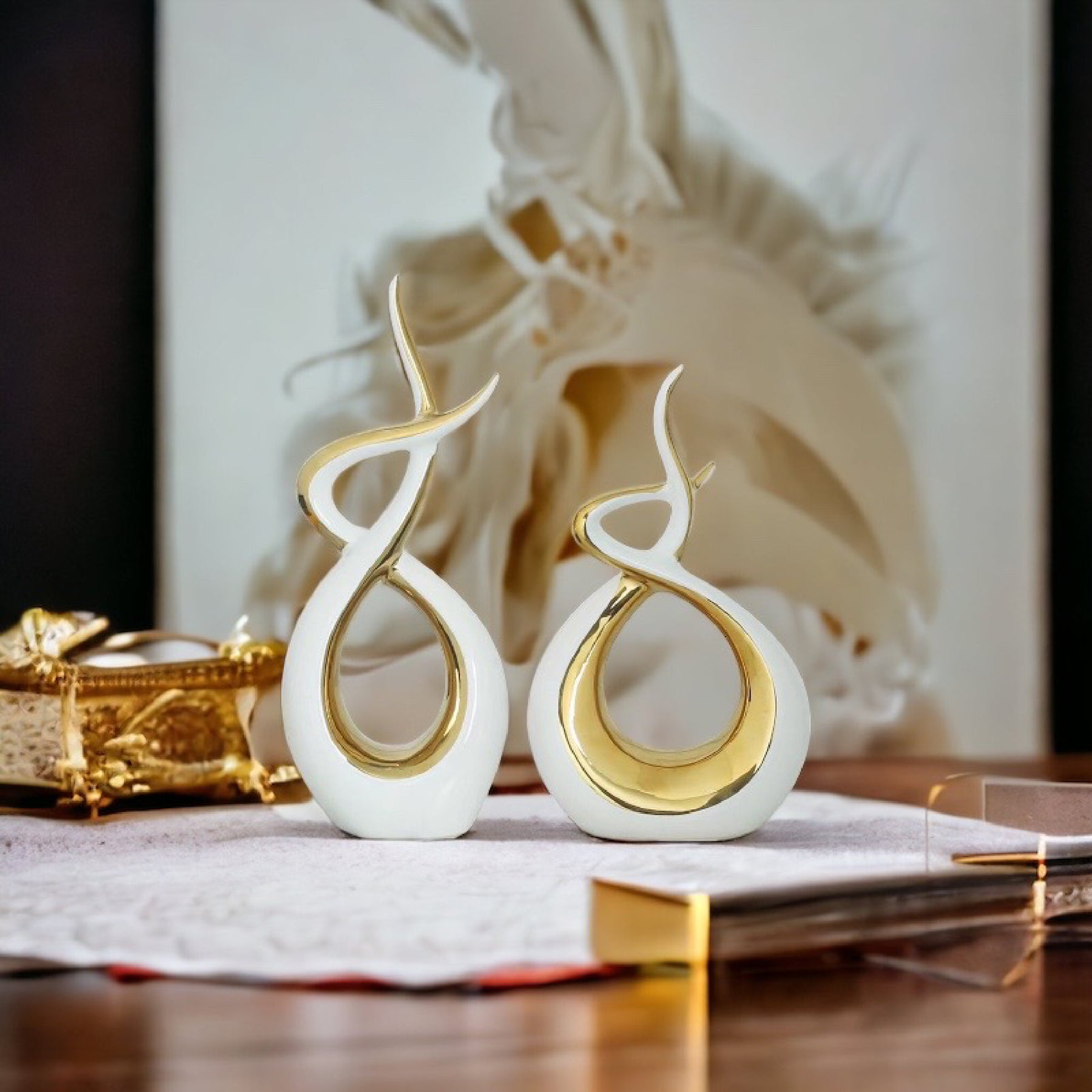 The Ceramic Flame Sculpture in white and gold is a unique expression of artistry and design. This piece features a gleaming, flame-inspired design with refractive inner rings. Crafted from high-quality ceramic for added resilience and finished with a gold polish for a lustrous, lasting shine.