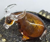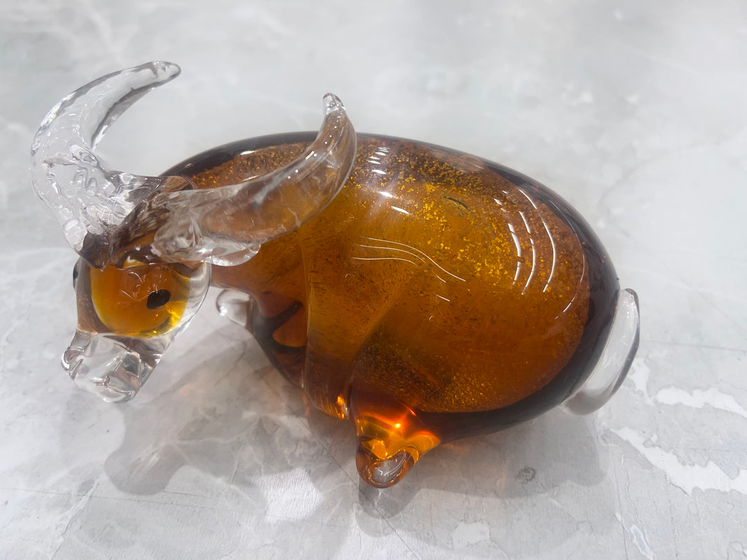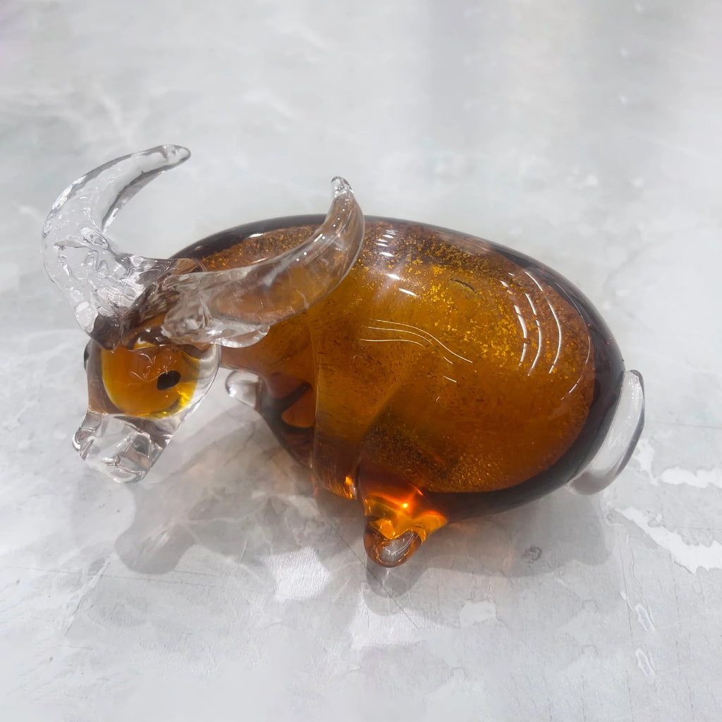 This Hand-Blown Glass Bull Sculpture showcases exceptional craftsmanship with its amber-toned glass body and crystal-clear accents. Its compact design and intricate details make it a perfect decorative piece for desks, shelves, or as a unique gift for art lovers.