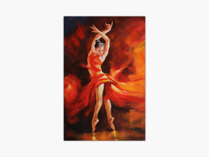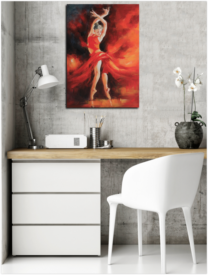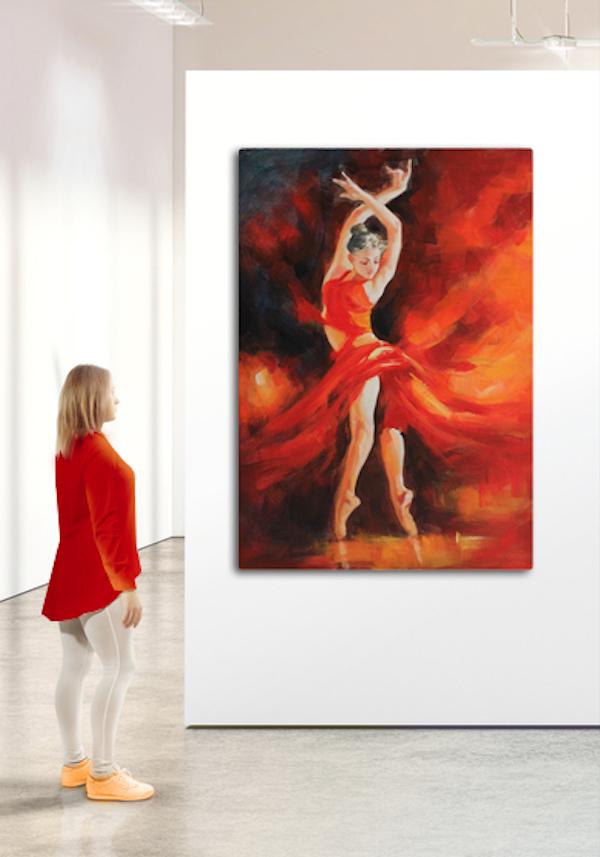 Fire, passion and color are the base of this stunning figurative art painting. Gorgeous ballerina is perfectly represented in her peak with speeded gorgeous red dress. A romantic celebration of dance, art and women.