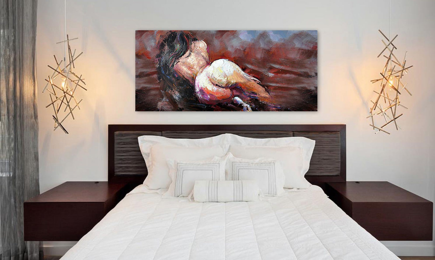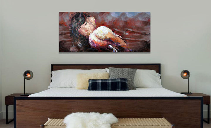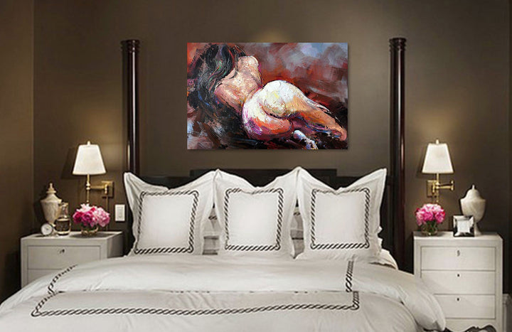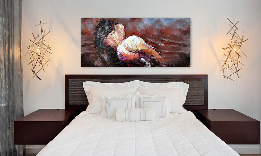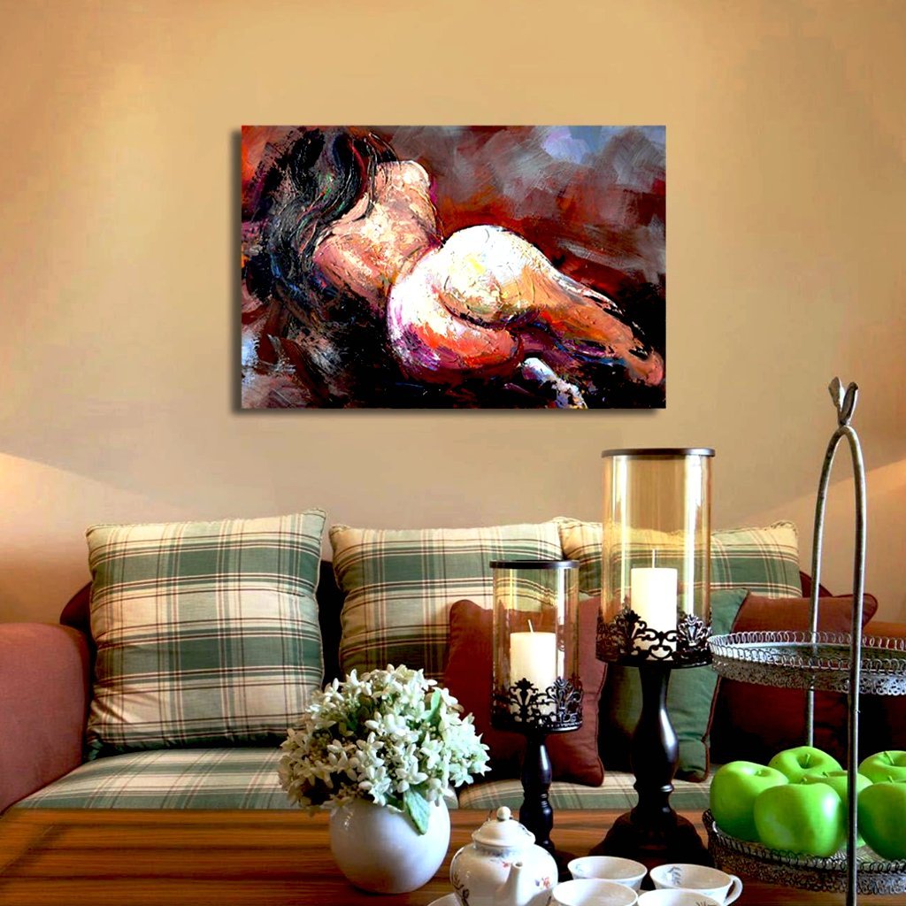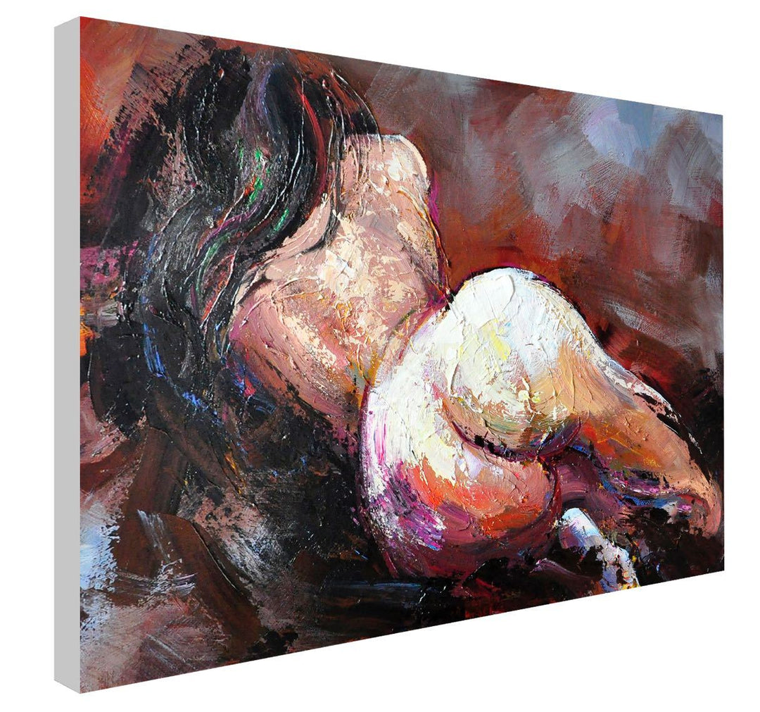 Provocative, yet inspiring, this lovely fine figurative art displays the beauty and seductiveness of the women's body. Painted from the back, this dark haired beauty is sure to add flair, buzz and fire anywhere where displayed.