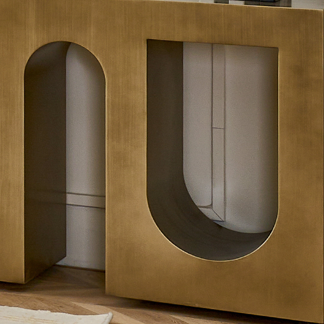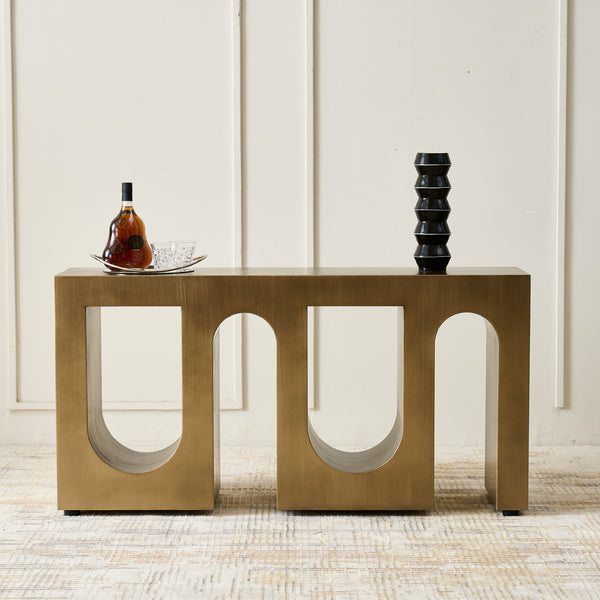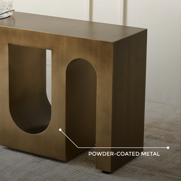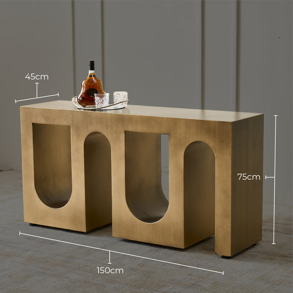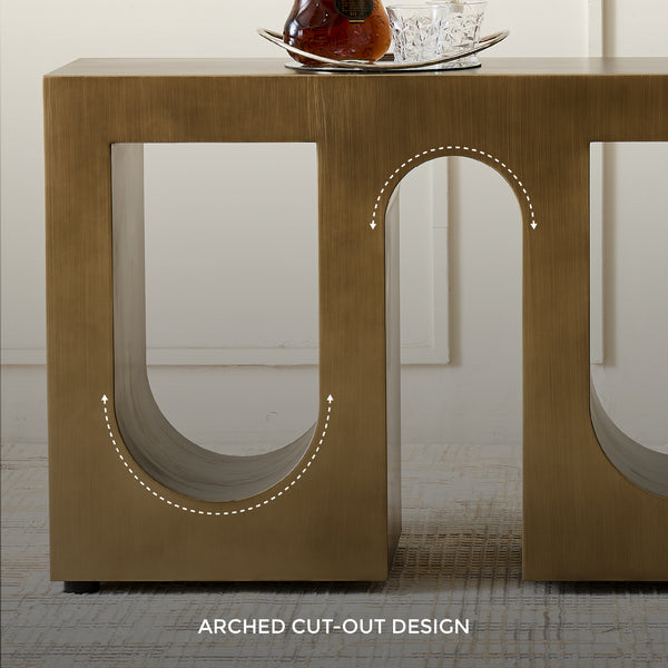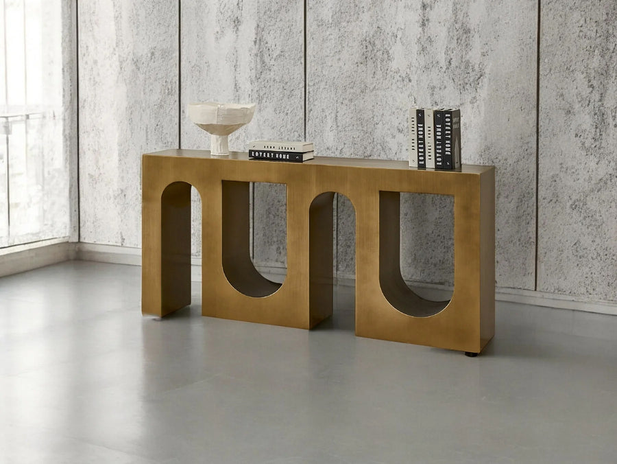 The Dublin Metal Console Table is designed with royal artistry, shape, and color. It is made from highly durable metal with a powder-coated gold finish. This hallway table is distinguished by its hollow arch base, featuring a unique design and a glossy gold finish. Place it in your entryway to glorify your interior.