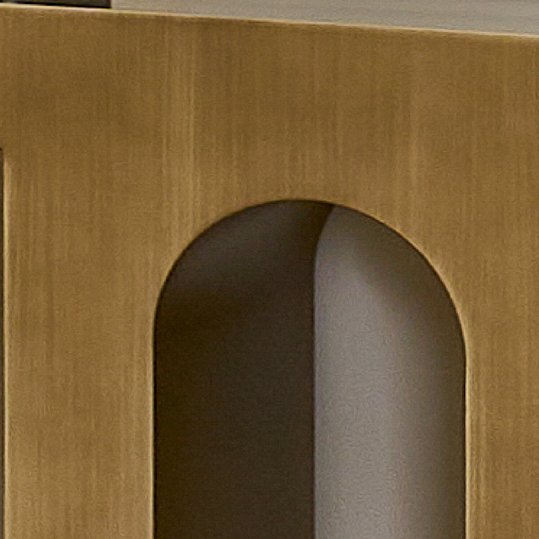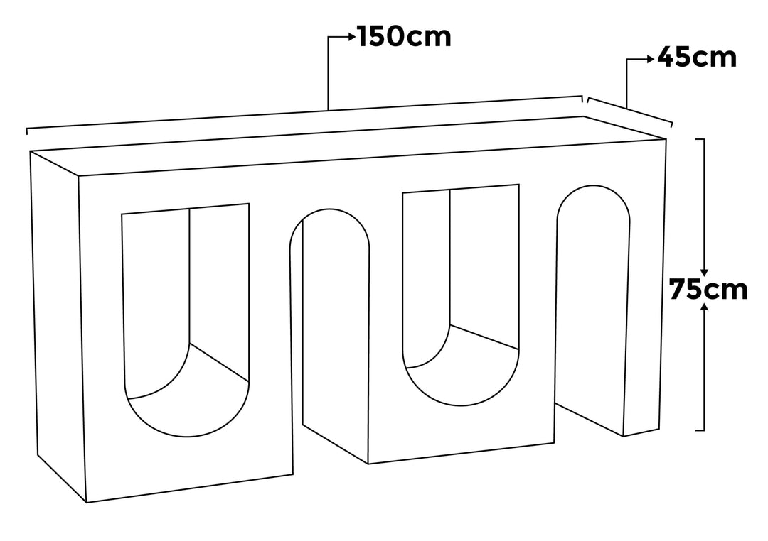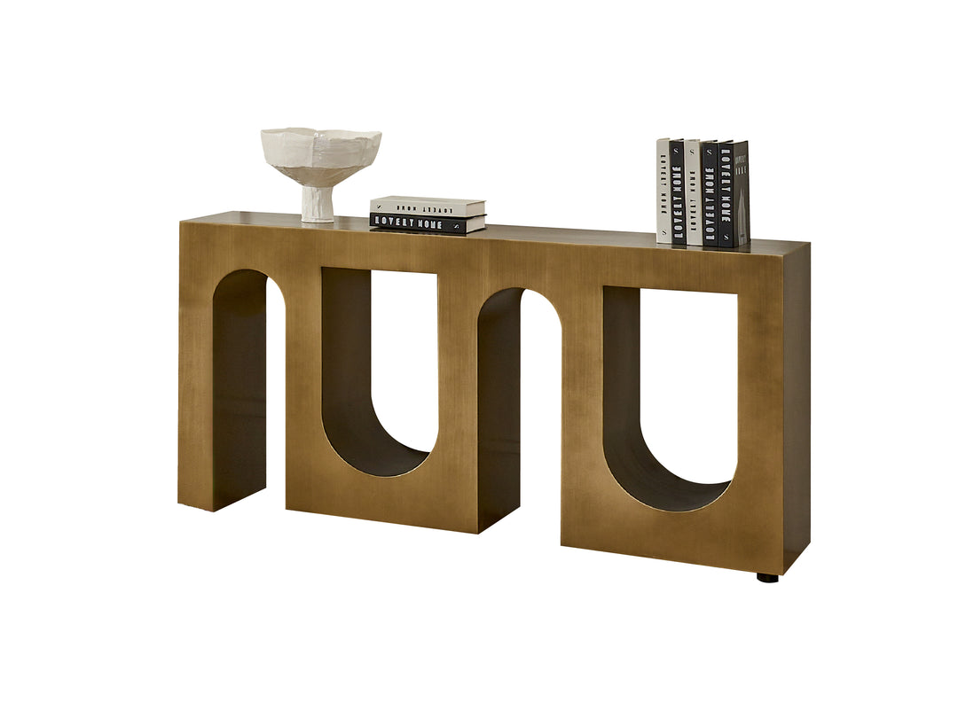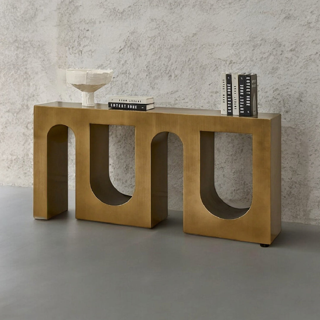 The Dublin Metal Console Table is designed with royal artistry, shape, and color. It is made from highly durable metal with a powder-coated gold finish. This hallway table is distinguished by its hollow arch base, featuring a unique design and a glossy gold finish. Place it in your entryway to glorify your interior.