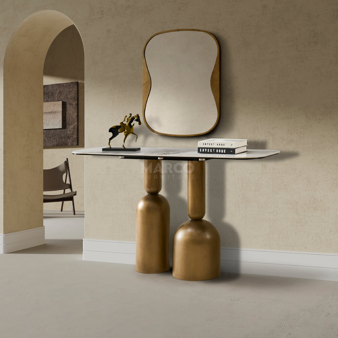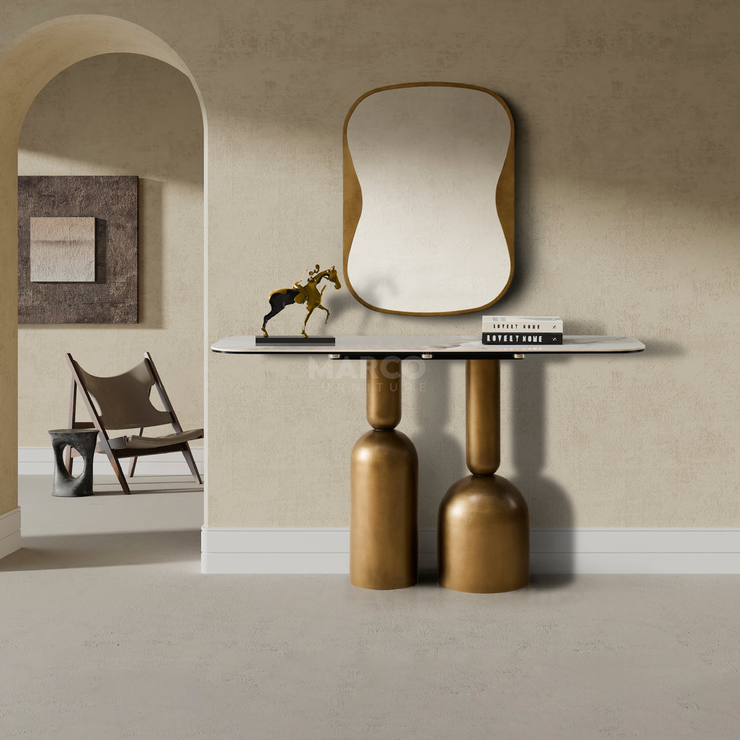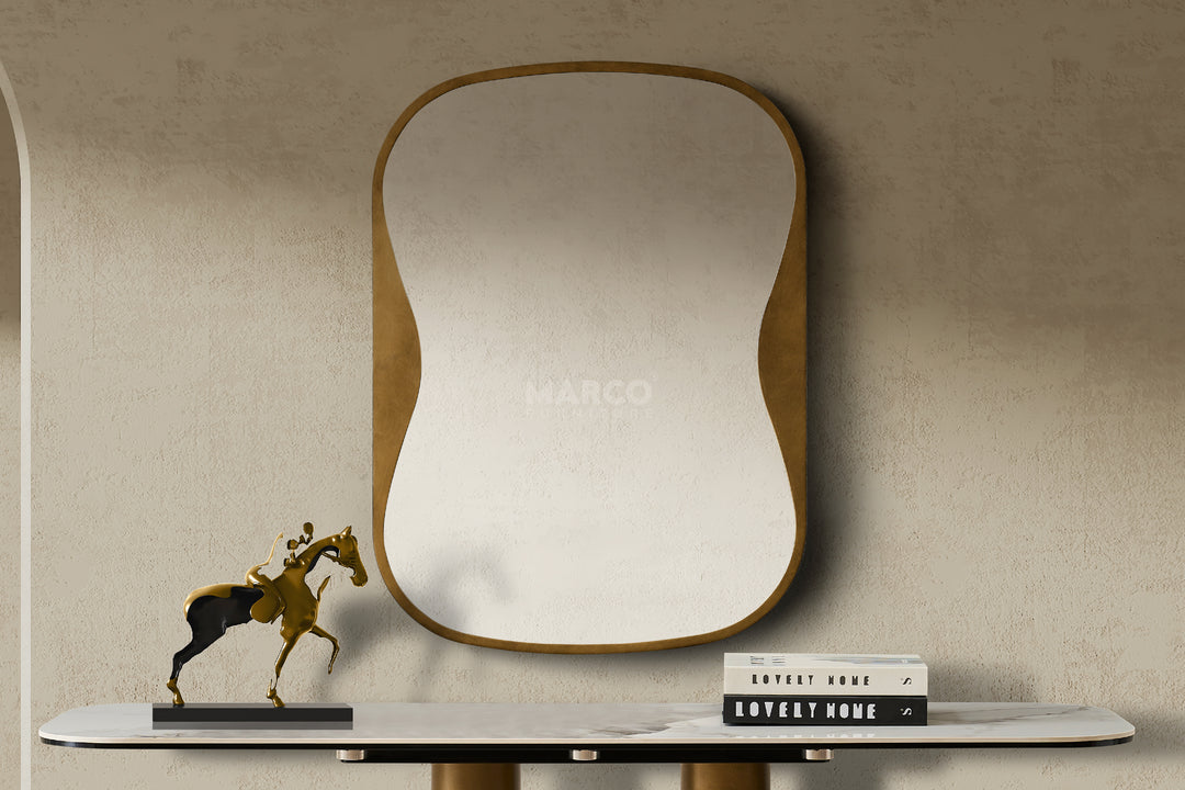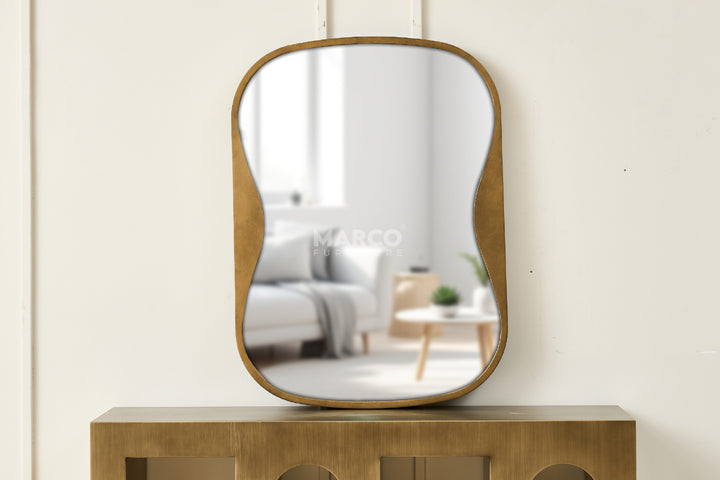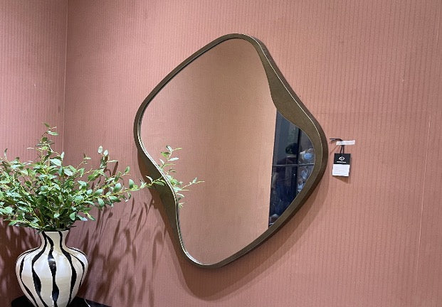 The abstract shape of the Dublin Large Wall Mirror is its distinctive feature. The mirror is framed in high-quality, powder-coated iron with a lustrous gold finish. This modern wall mirror is a stunning reflective piece for your hallway, living room, or bedroom.