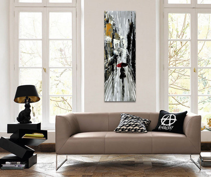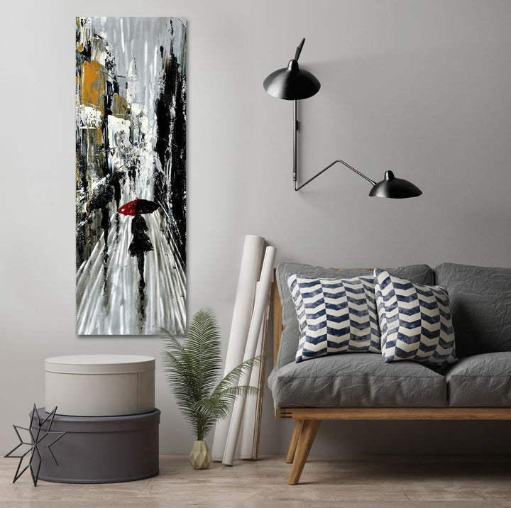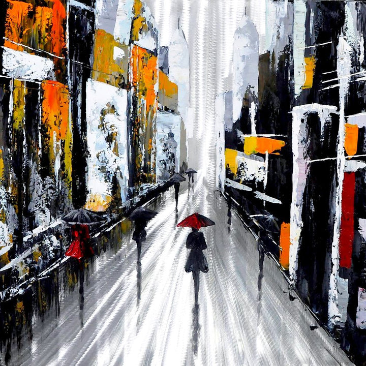 Dreamy, warm, yet dark and thick, Colorblind Dead-end is a play of color, lines and process that expresses the frustration of dead-end streets. Several strangers in the rain are walking towards something that can't be passes. Mixture of abstract and figurative art that is simply astounding.