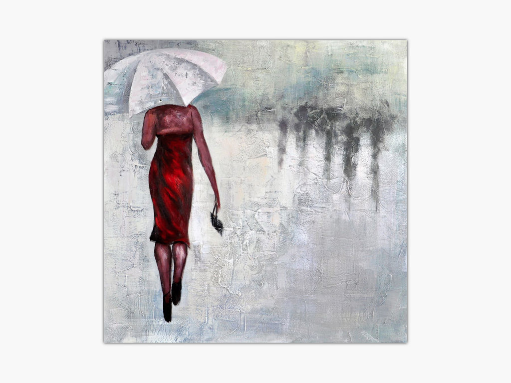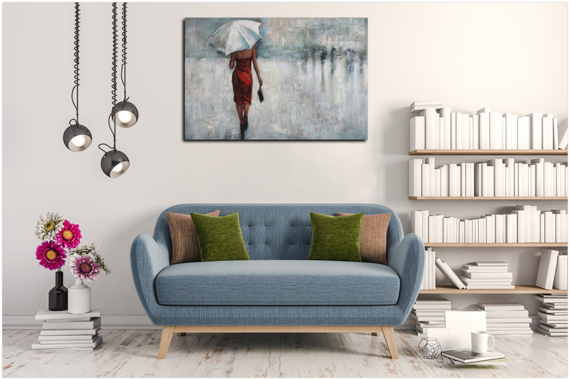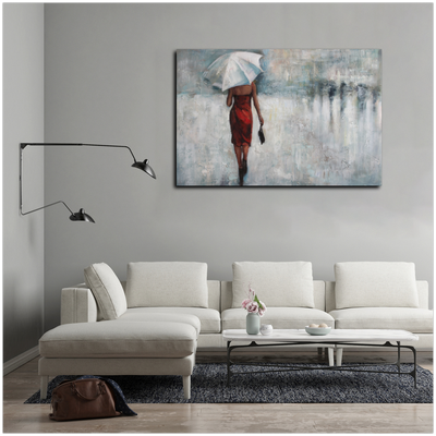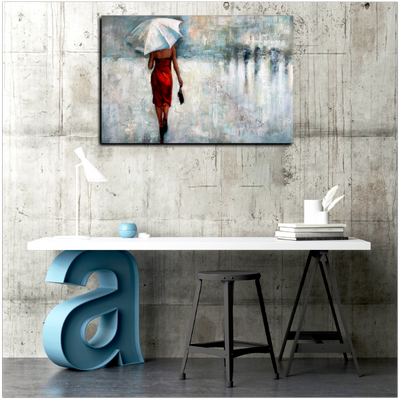 Greyish and dark, yet passionate, Rainy Appointment is displaying the pure determination of a women in love. Wearing a gorgeous red dress and white umbrella, she is determined to meet the man she loves. A romantic representational abstract that can give artistic soul to your interior.
