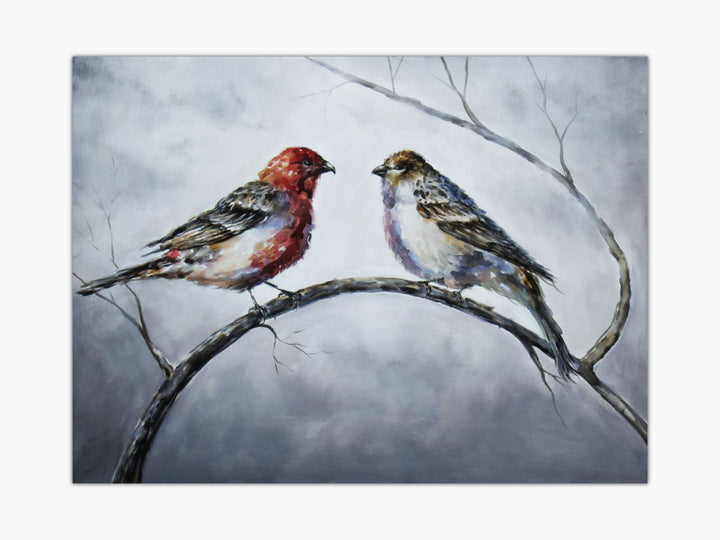 The sophisticated and highly elegant combination of the faded lacquers is enticing and provoking in itself. The murky background highlighting the main painting of the birds with the most delighting hues and the complexion intermixing and the fusion of the pigments influences in the first place. The grey representing the neutral zone of the conversation and the gossips in the bird painting.