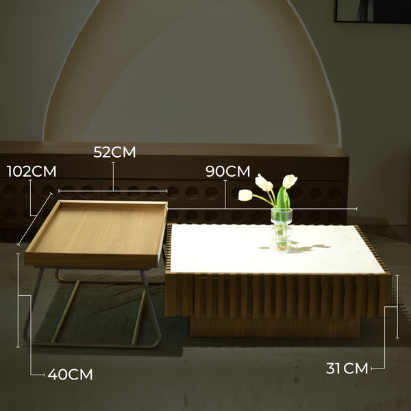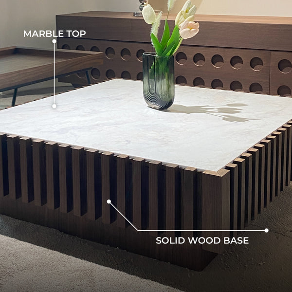 - Materials: Premium marble top and solid wood base with slatted detailing.