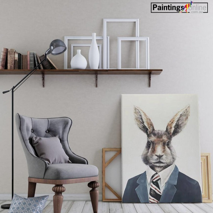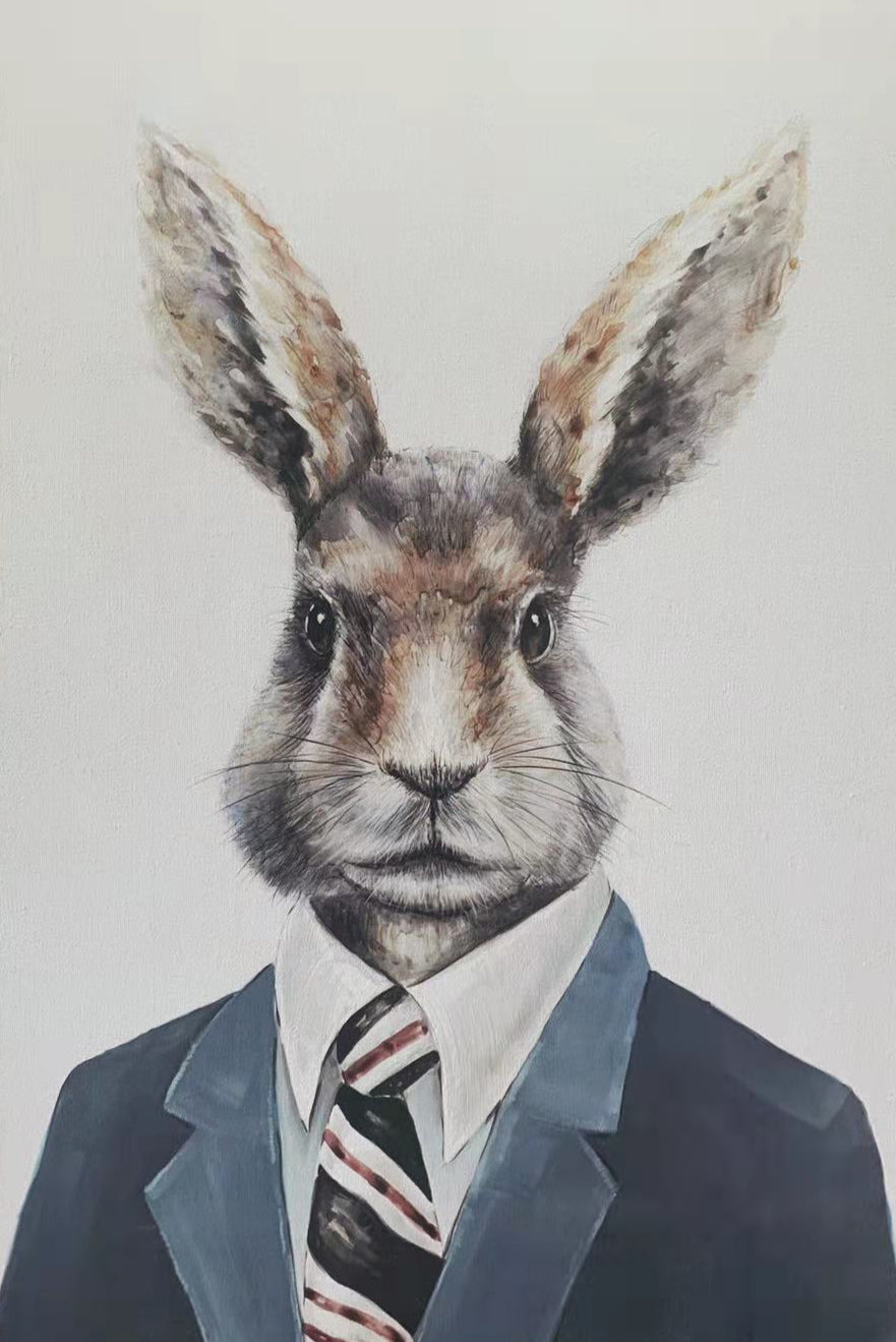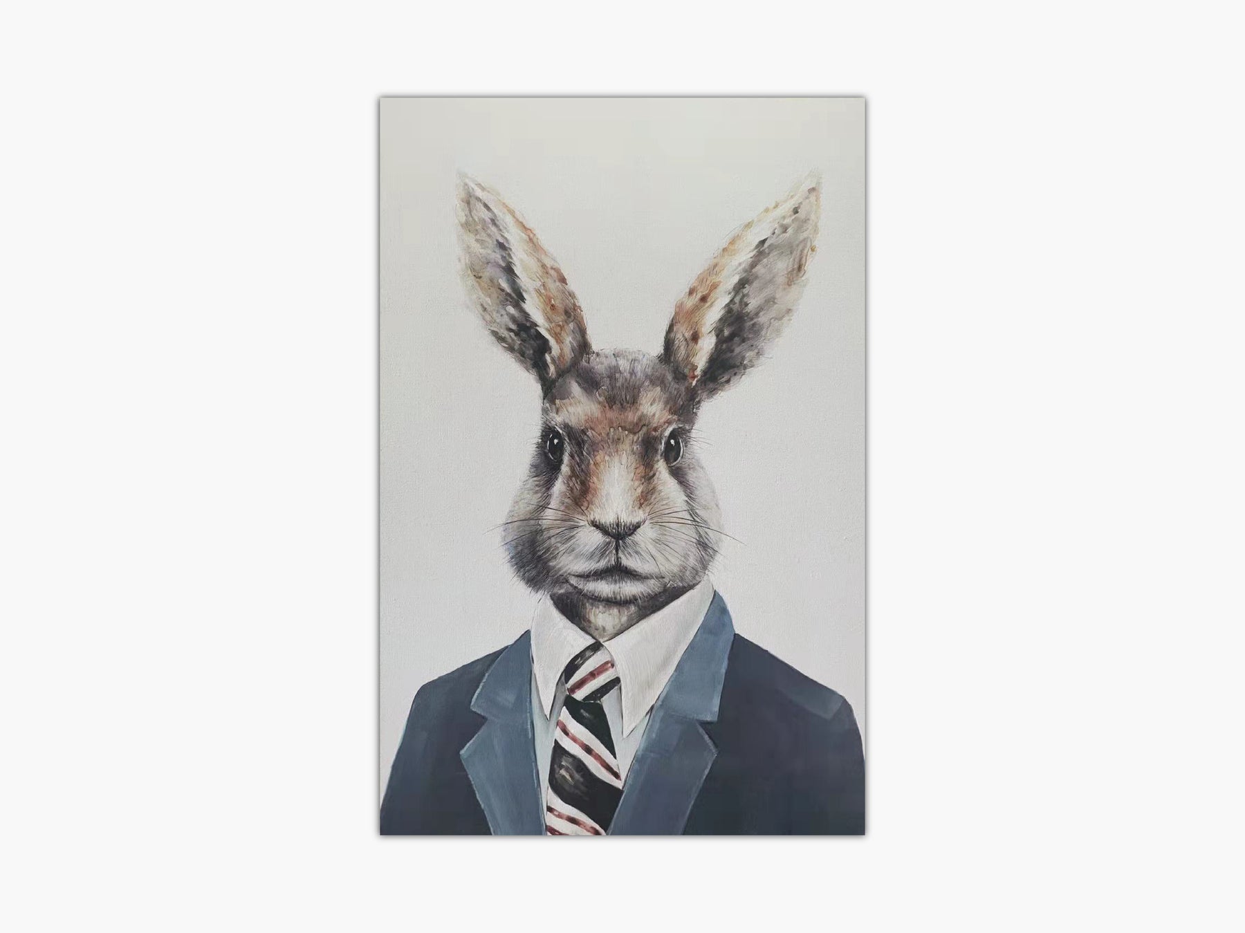 Depiction of double faced society is the specialty of this portrait. The canvas painting having exuberant elucidation of a rabbit personified with the most vivid colored tuxedo mesmerising the attention through the still stare. The white background evidently in this animal art adds to the prestige of the silhouette. This art cherish the viewer with an unrestrained and enthusiastically intense portrayal.