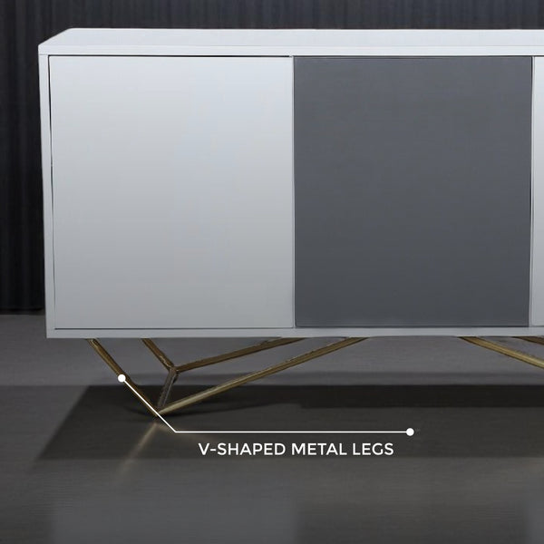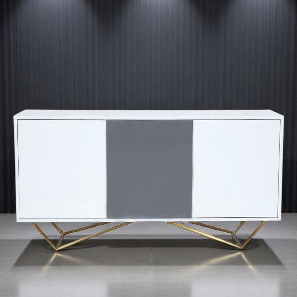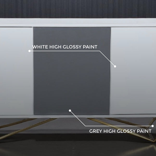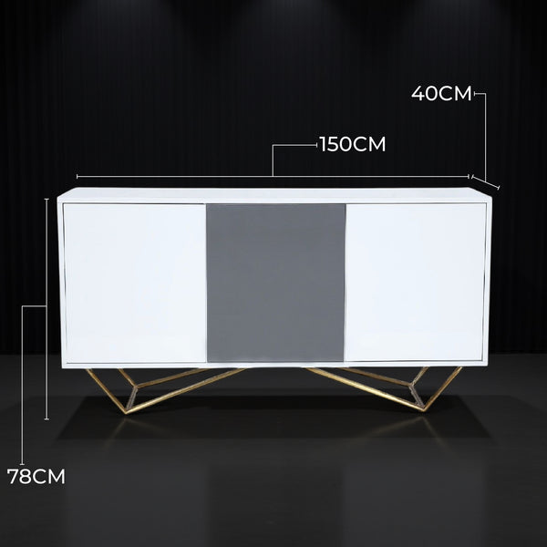 The modern Lacy Buffet is built to provide storage and add grace to your living spaces. It combines a high-quality MDF body with a gloss finish and durable metal base. This sideboard features three cabinets with soft-close doors, finished in high-gloss grey and white paint. It’s perfect for keeping your space tidy and organised.
