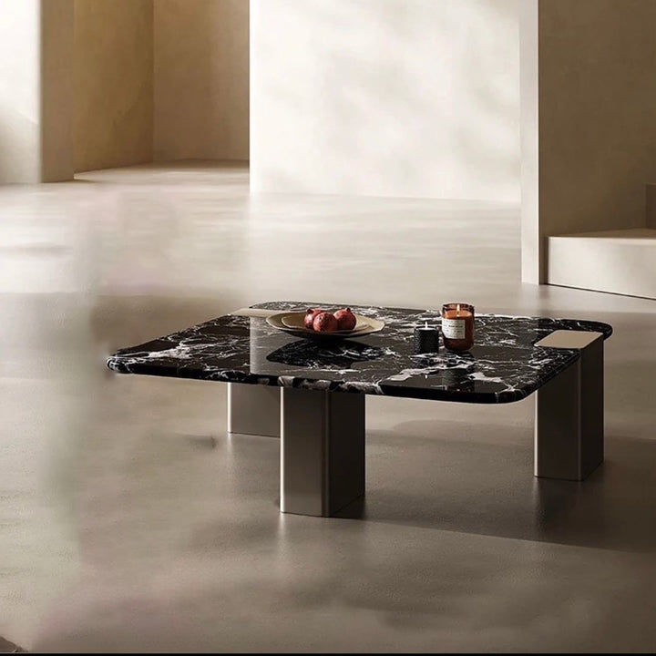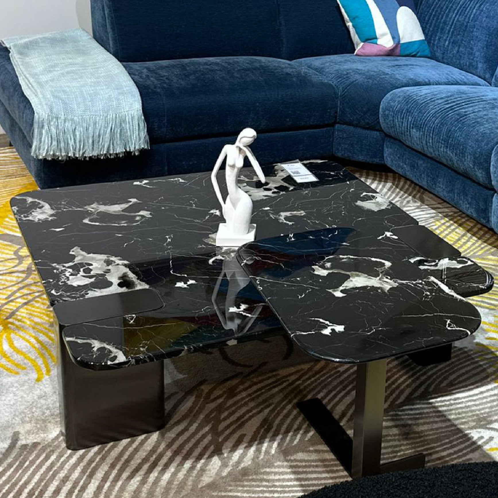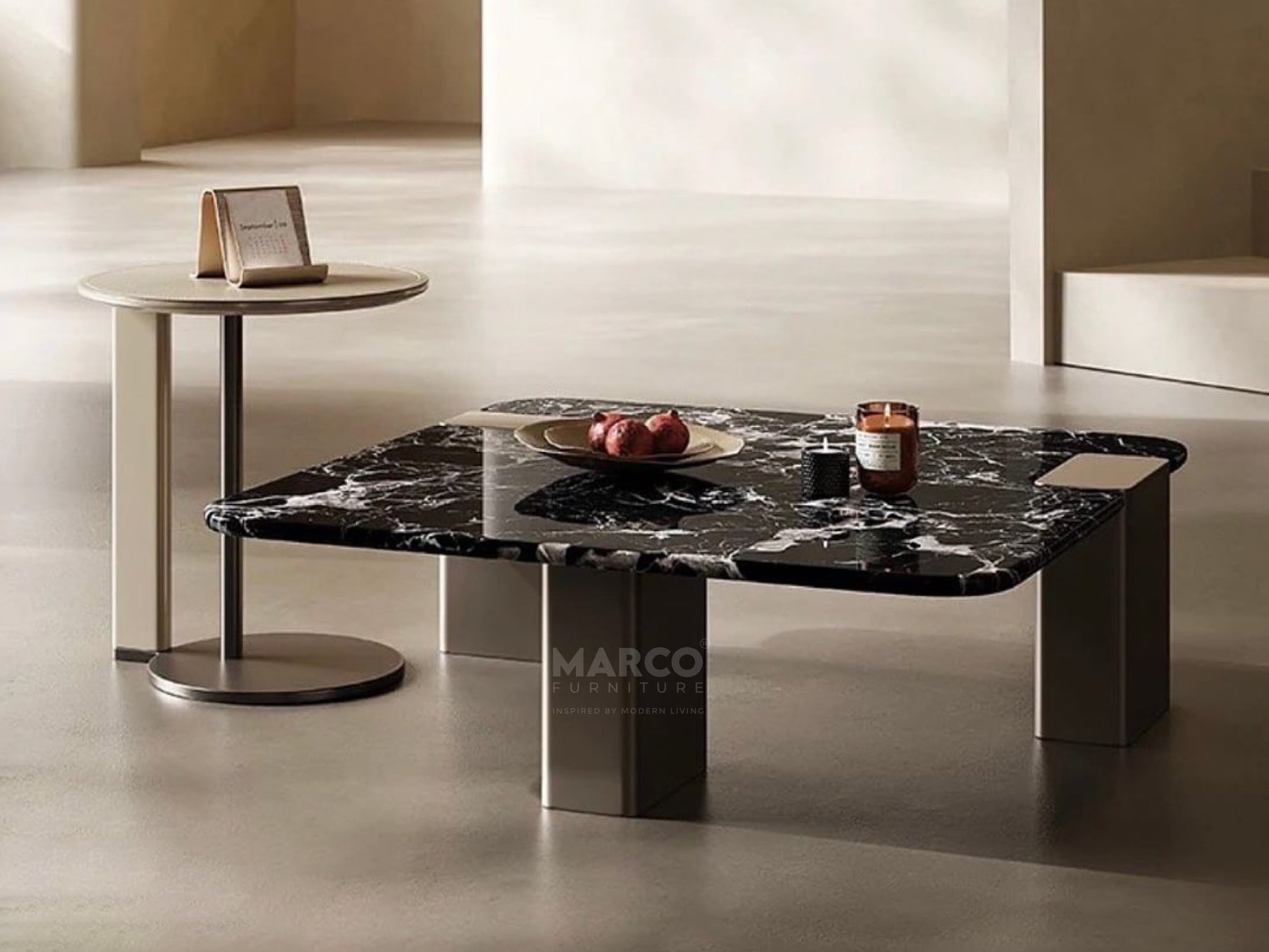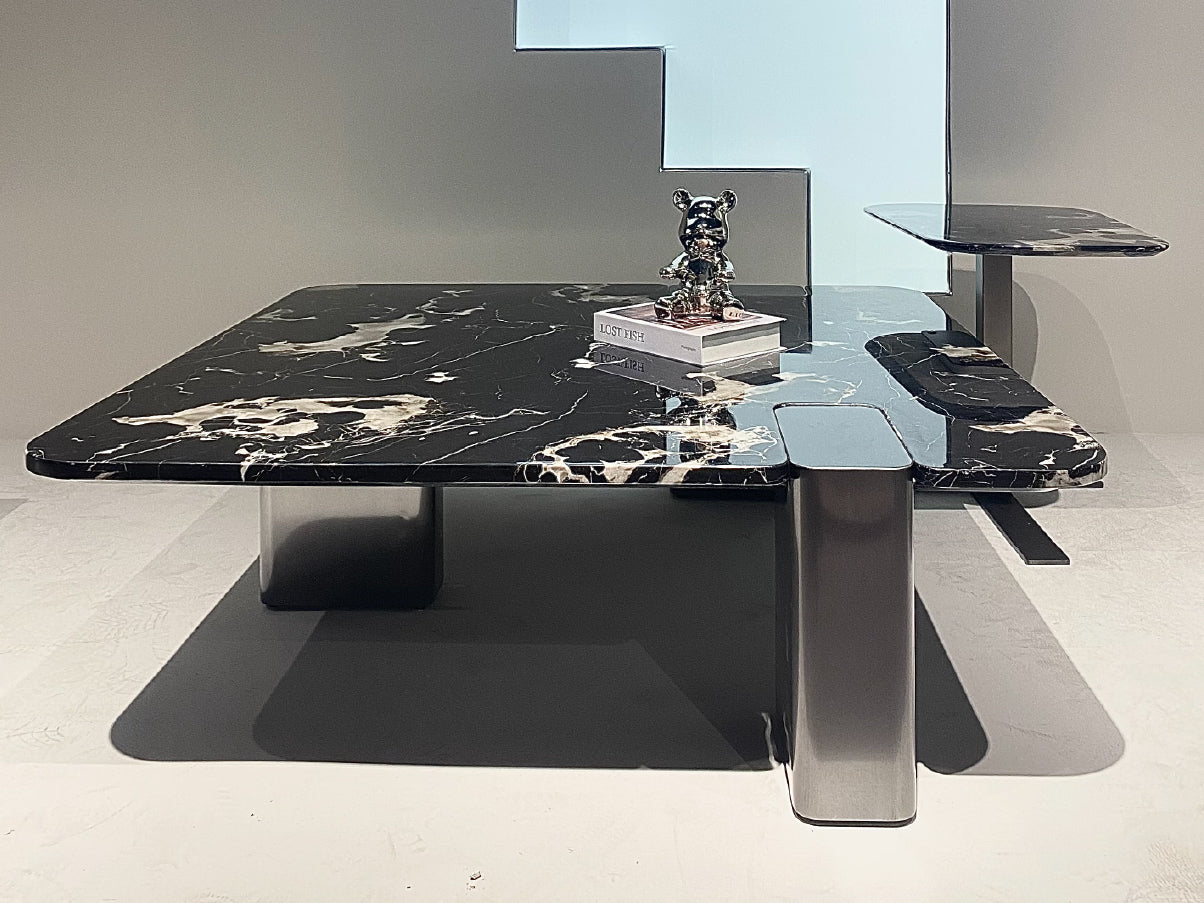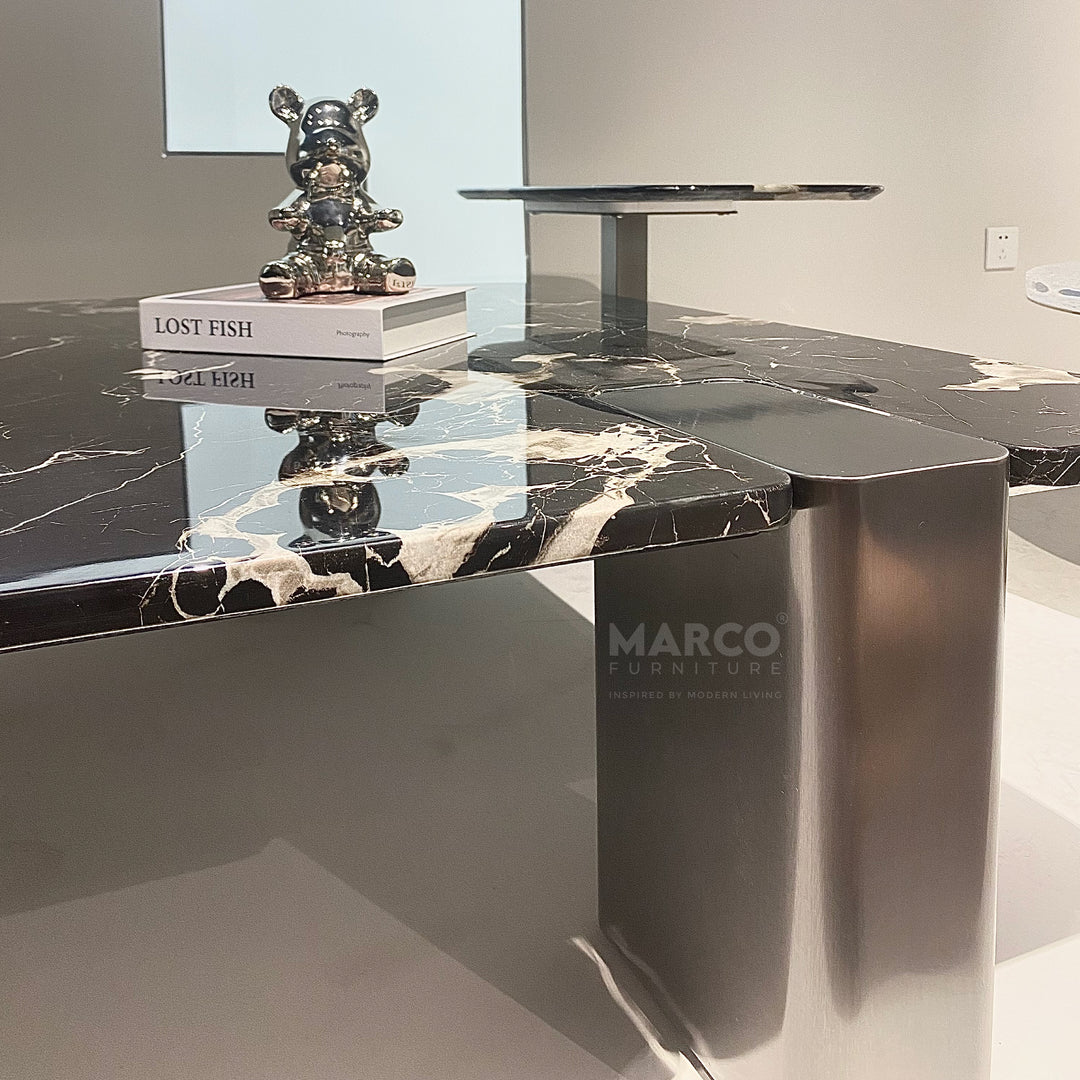 The Lapis Black Rose Marble Coffee Table features a stunning black rose marble top paired with a sleek stainless steel base, providing a perfect display for contemporary living room decor. Complete the look with the matching side table, available at an additional charge.