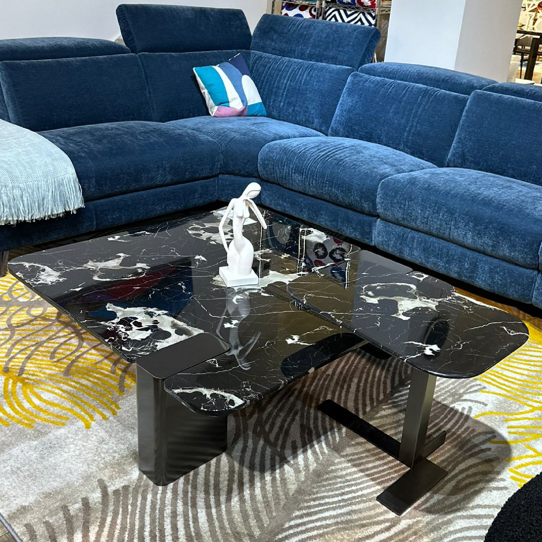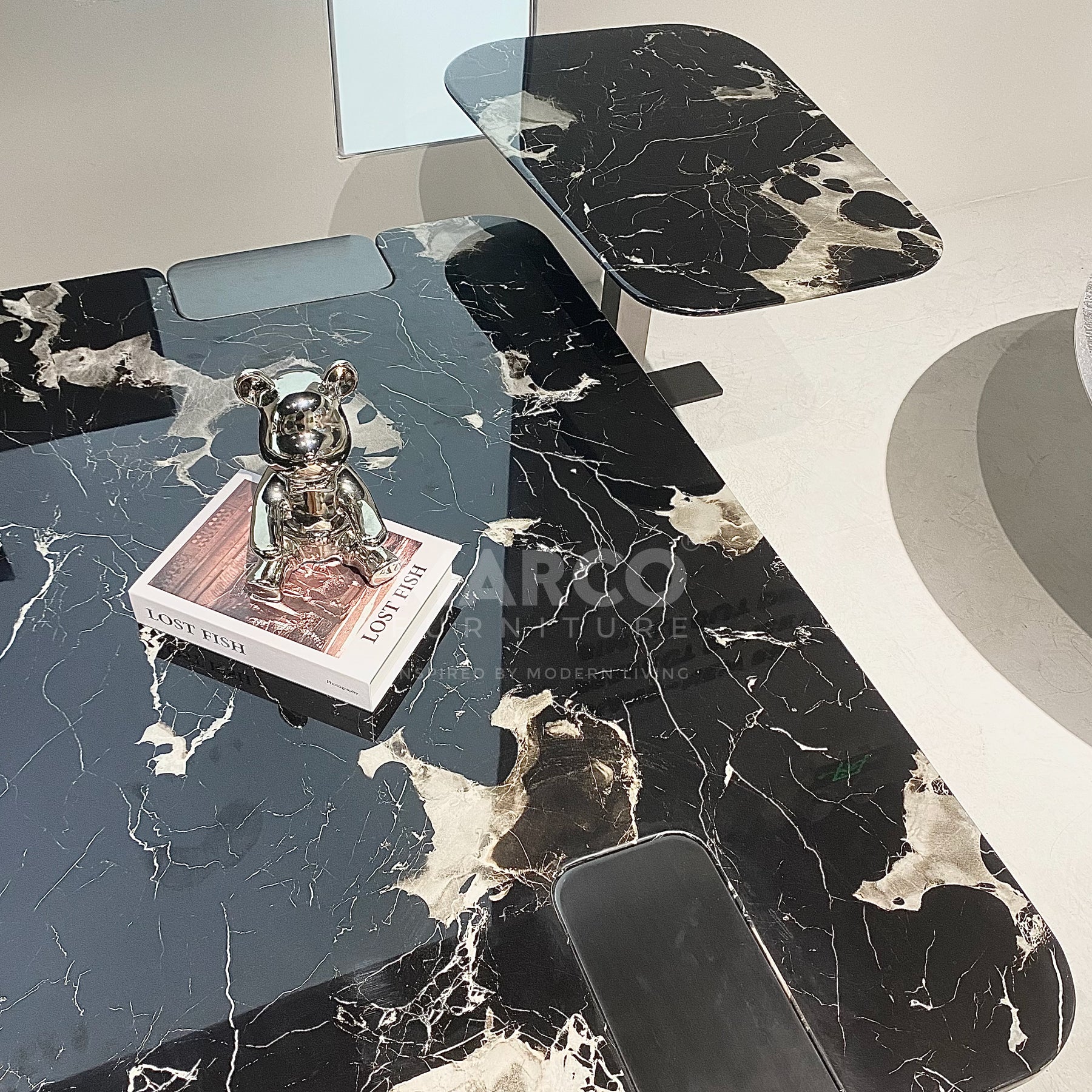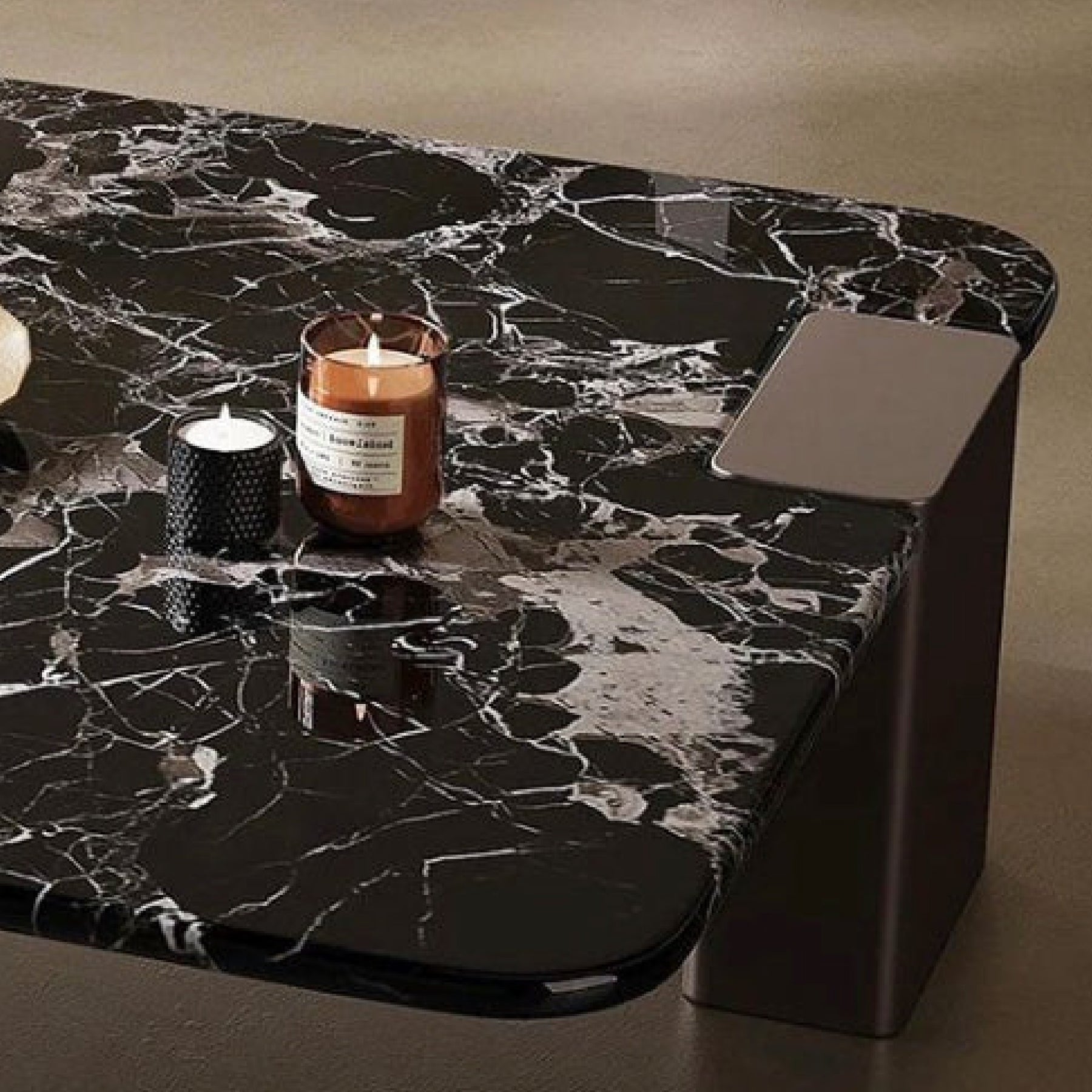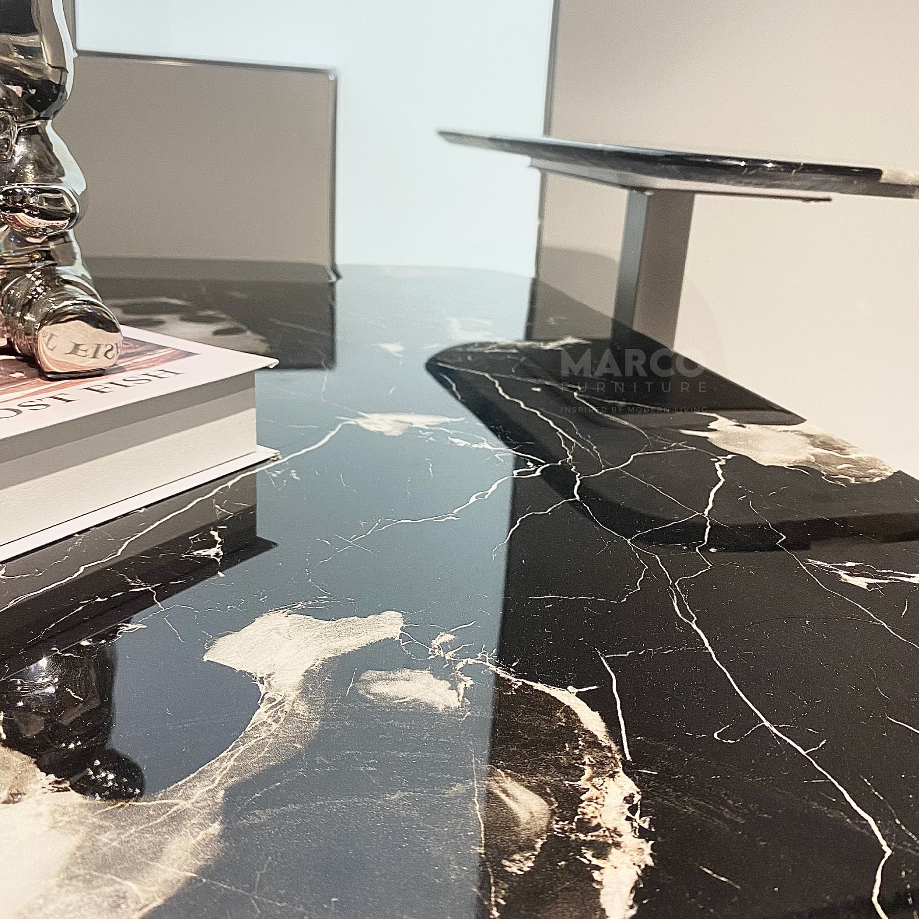 The Lapis Black Rose Marble Coffee Table features a stunning black rose marble top paired with a sleek stainless steel base, providing a perfect display for contemporary living room decor. Complete the look with the matching side table, available at an additional charge.