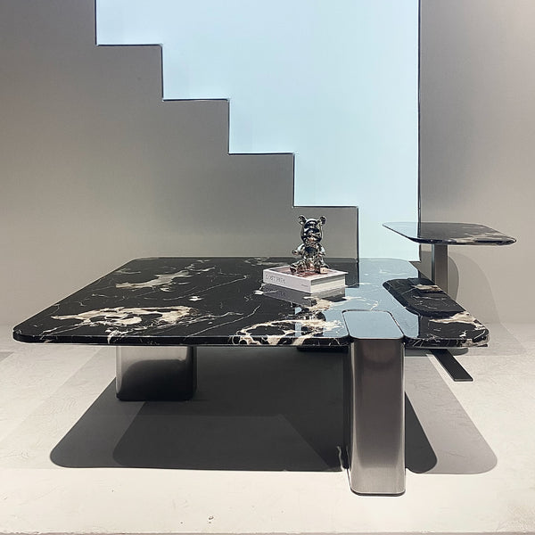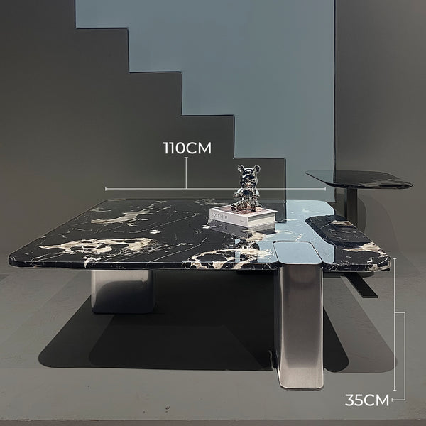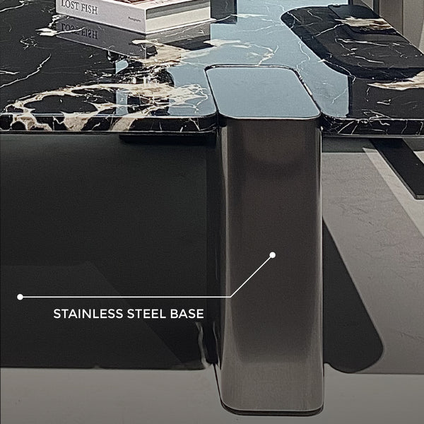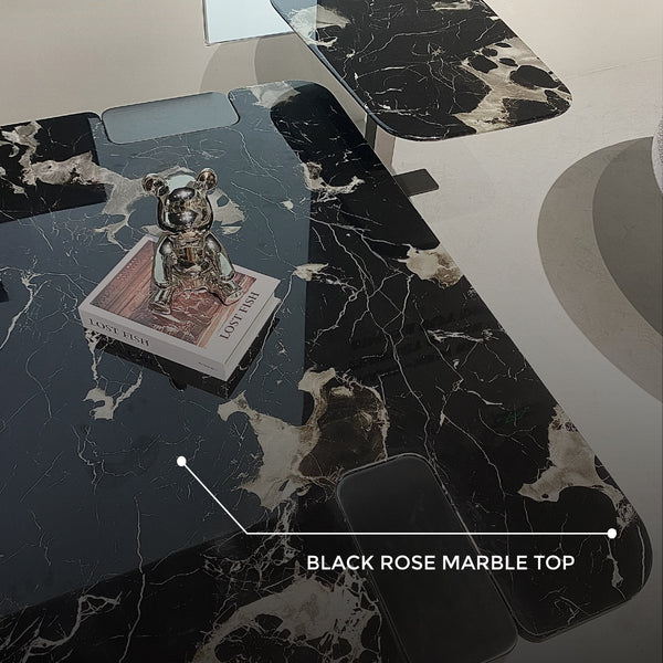 The Lapis Black Rose Marble Coffee Table features a stunning black rose marble top paired with a sleek stainless steel base, providing a perfect display for contemporary living room decor. Complete the look with the matching side table, available at an additional charge.