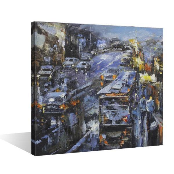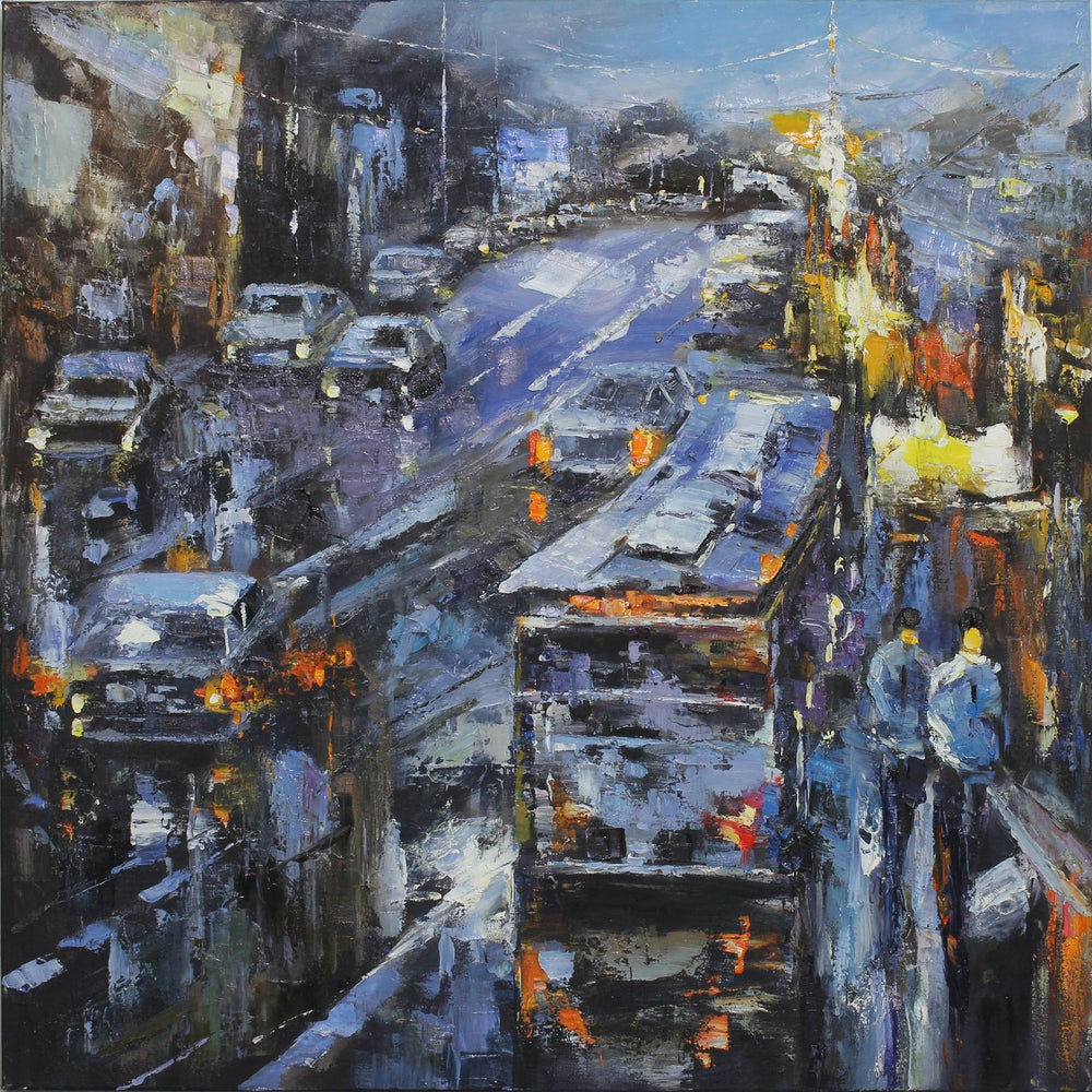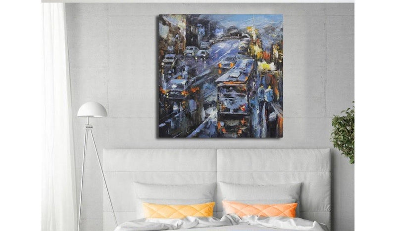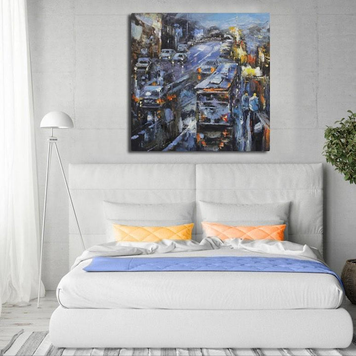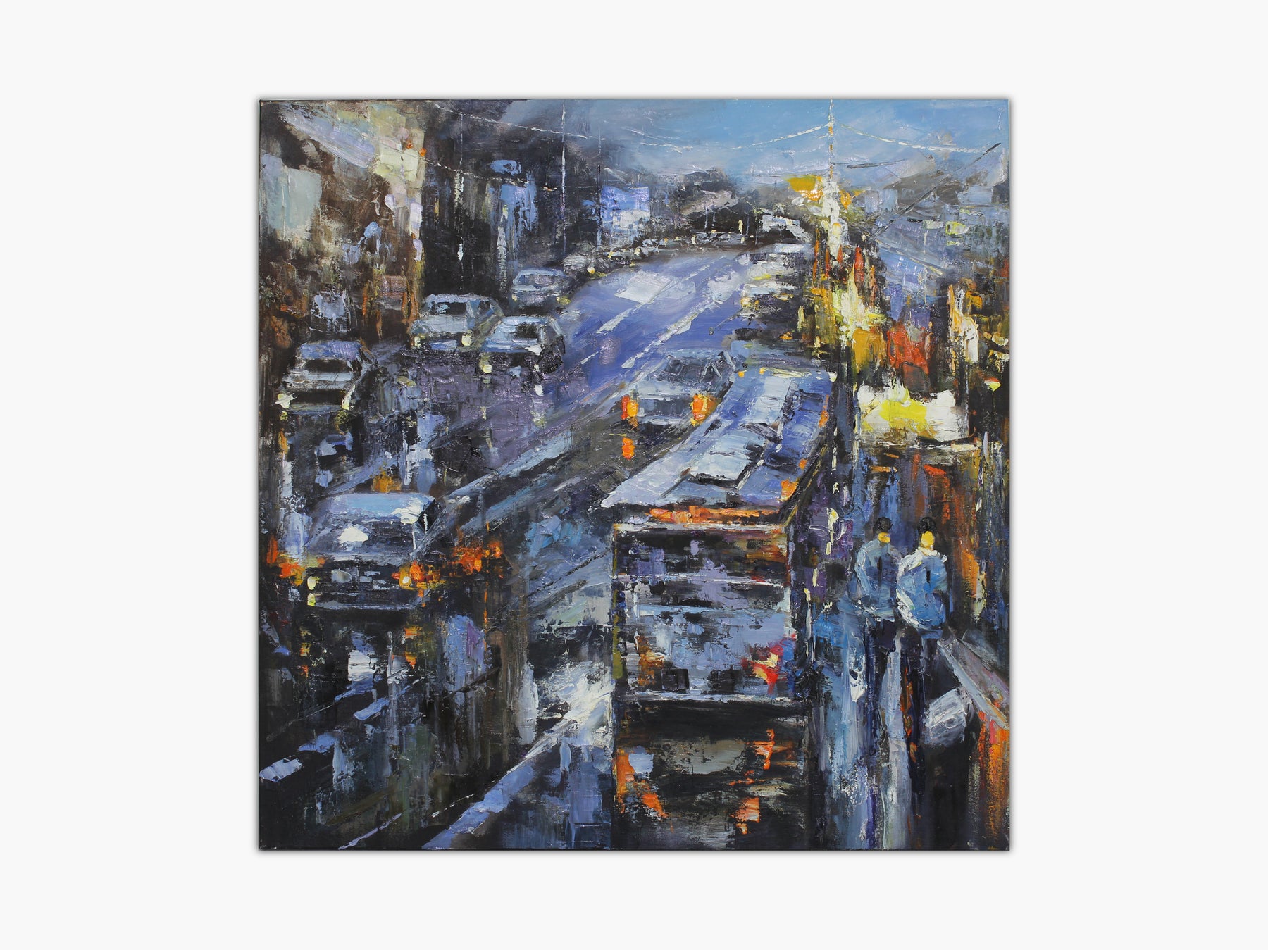 This abstract landscape painting is representing the messiness and rush of the modern life. A city landscape filled with cars, buses, and people, painted with thick, dark, messy layers and lines. An urban expressive masterpiece.