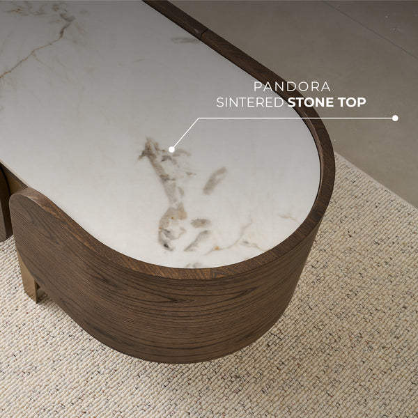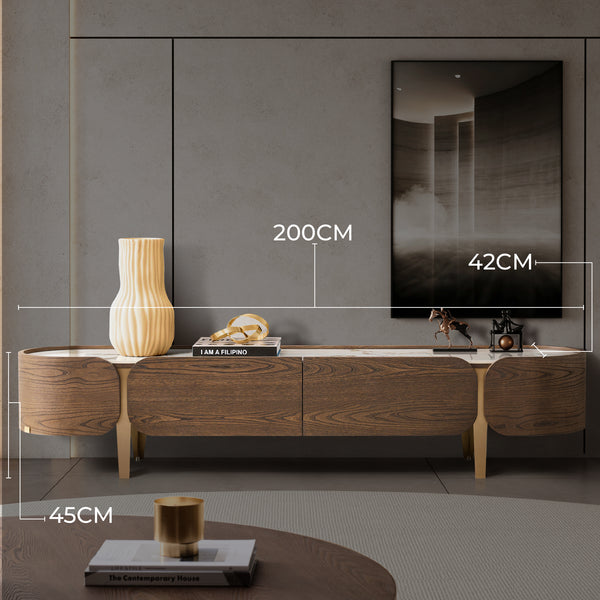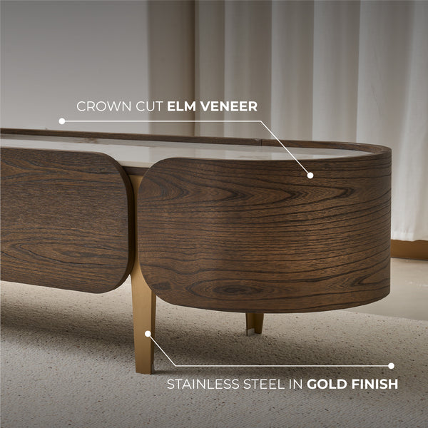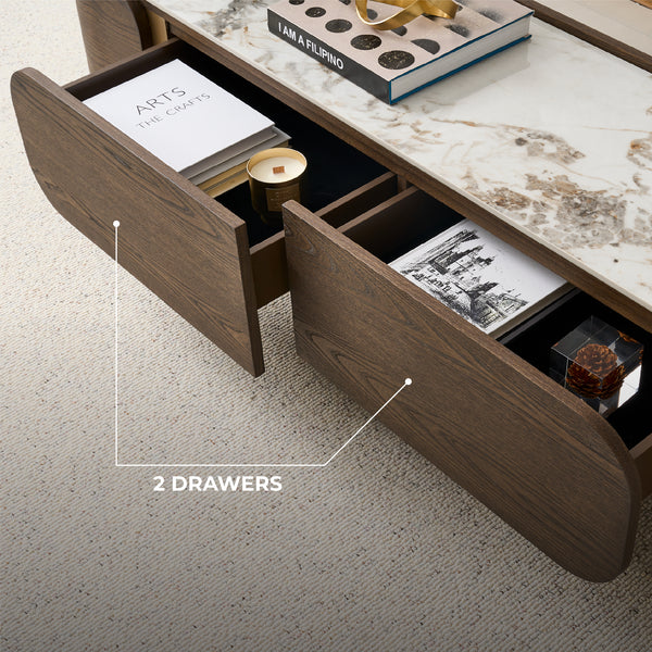 The Mont Blanc Sintered Stone Top TV Unit features a softly curved frame, crafted from natural elm veneer and MDF for a rich grainy texture. Its Pandora sintered stone top, with a veined pattern, provides an ideal surface for your television, record players, and decorative pieces. With two storage drawers, this entertainment unit helps keep your living room neat and clutter-free.