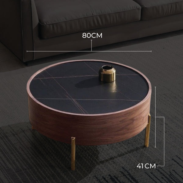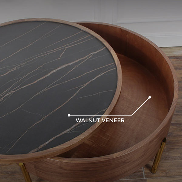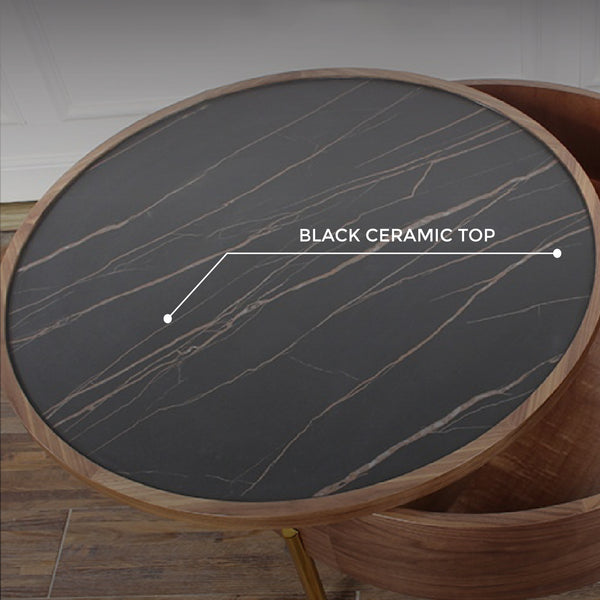 Moon Extendable Coffee Table features a round design with a graceful black ceramic top, a rich walnut veneer frame with integrated storage, and lustrous gold stainless steel legs. The sliding top reveals a spacious compartment for hidden storage, combining functionality with a modern and luxurious aesthetic.