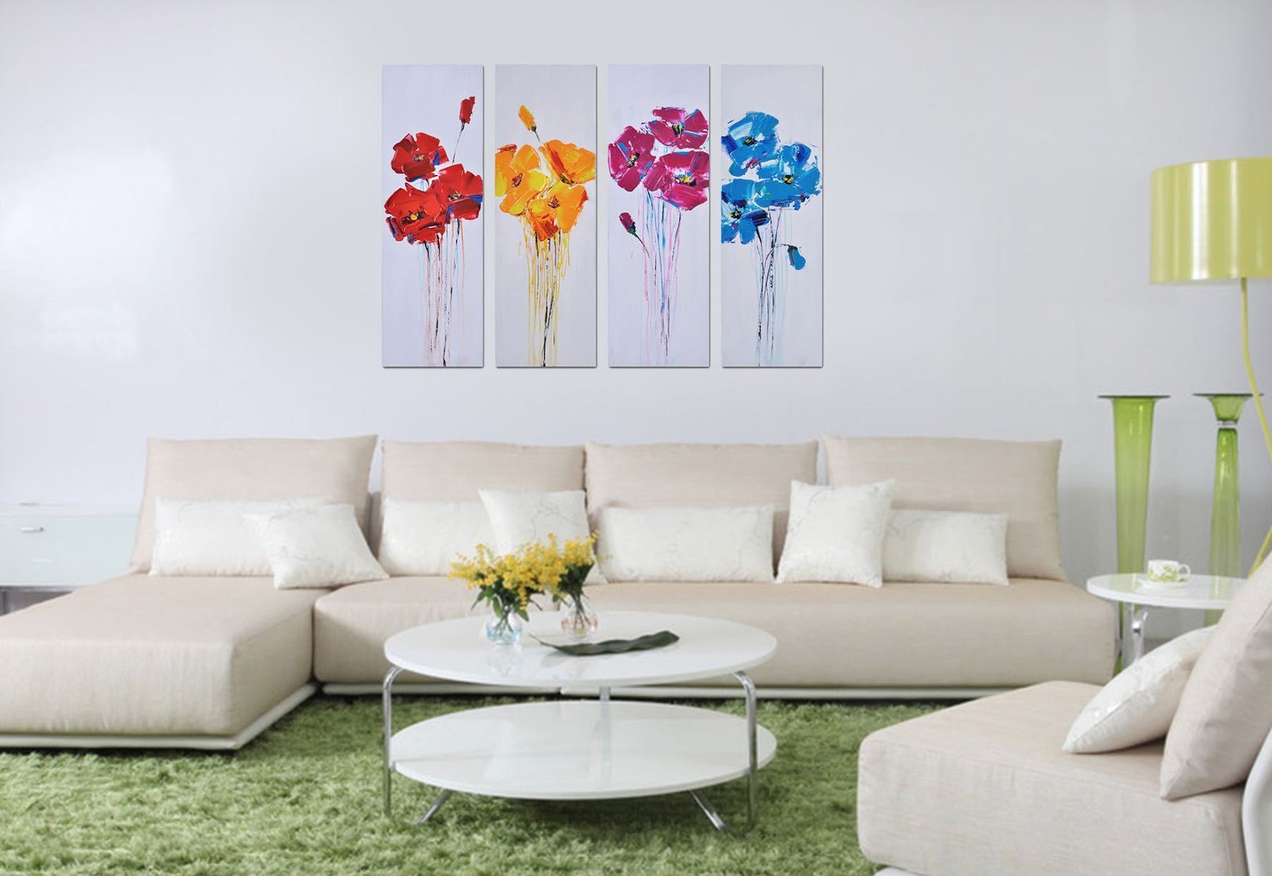 A mix of abstract and metal art, this stunning painting features vibrant drops of blue, purple, red and orange masterfully conveyed into one piece. The multi-panel painting features flowers in different shapes on a grey background. Stunning art piece for the modern homes.