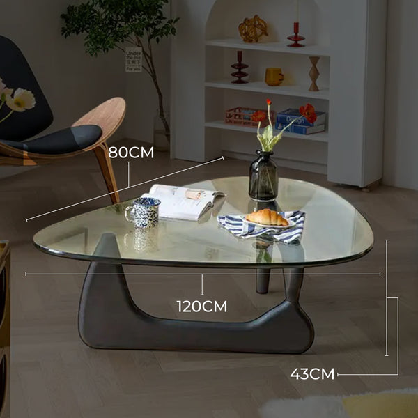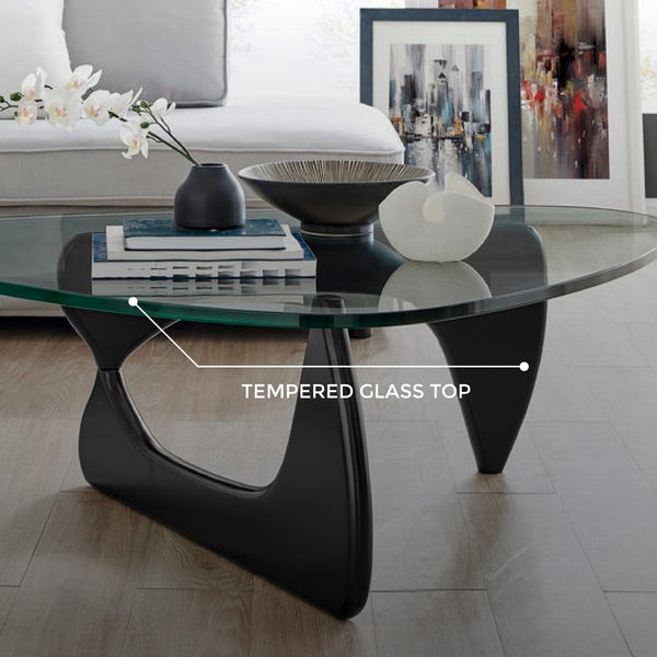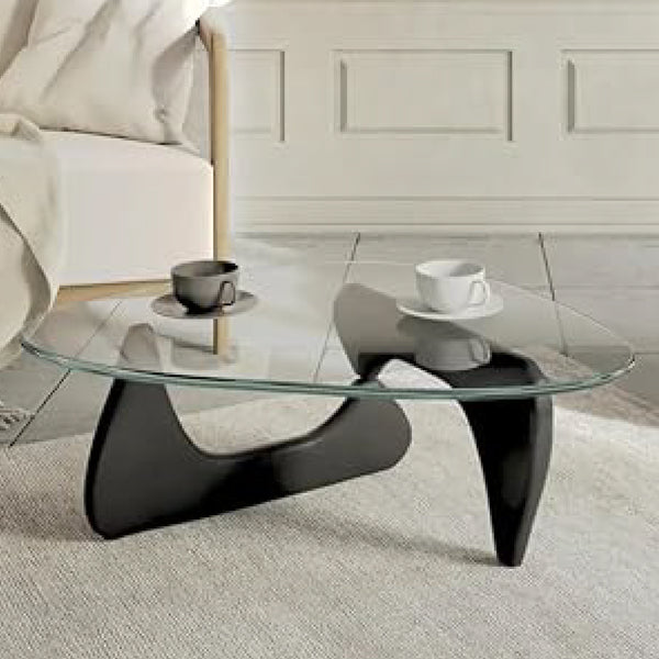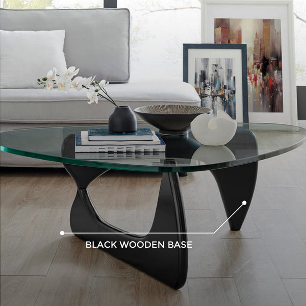 The Noguchi Coffee Table by Isamu Noguchi features a simple yet stylish design, perfect for modern spaces. This coffee table has a durable tempered glass top with a triangular shape and curved edges. Its unique base features black wooden base that creates an interlocking shape. This glass coffee table table is the perfect addition to both modern and rustic living rooms.
