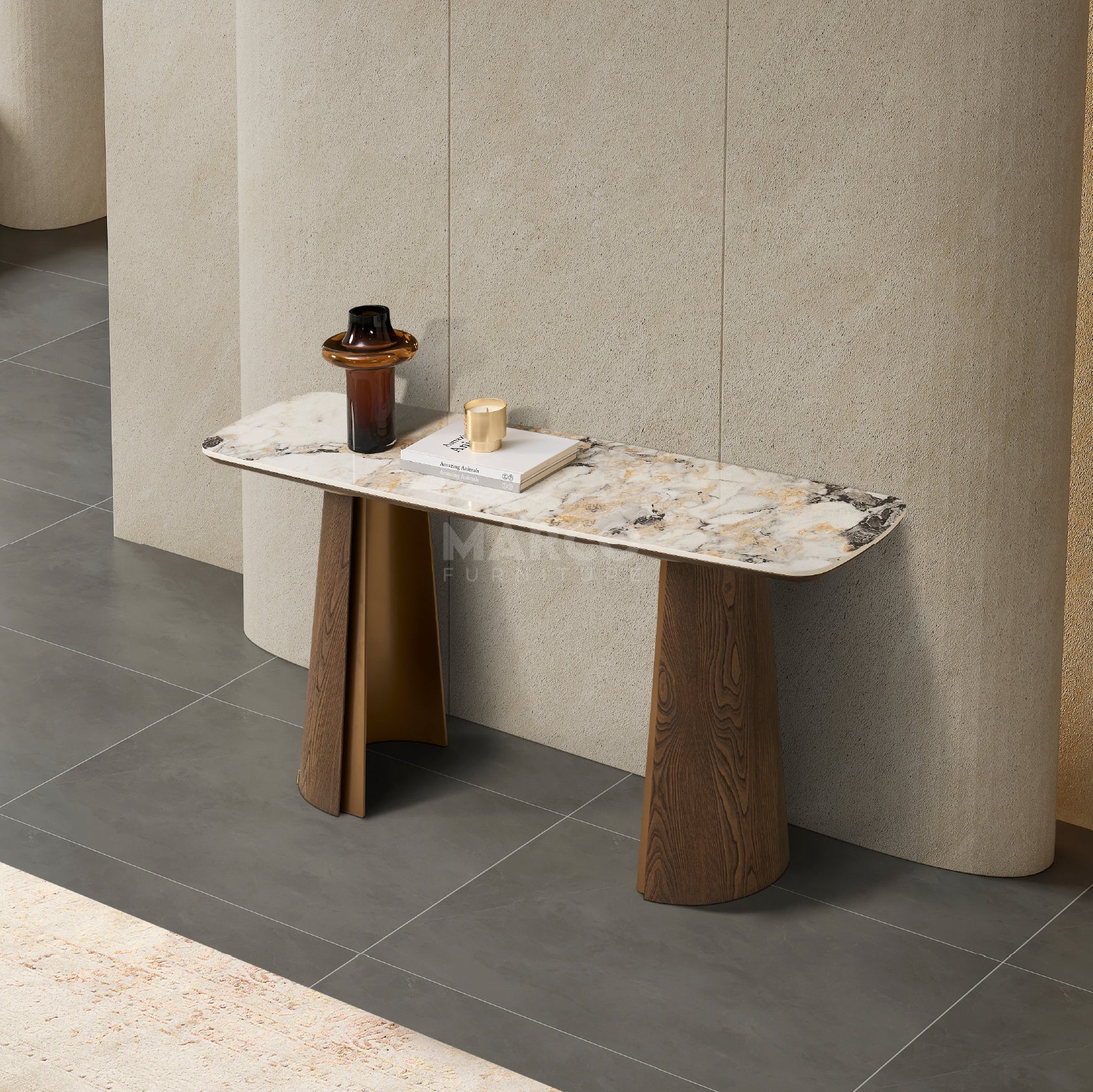 The Olmo Fiorito Hallway Table features a sintered stone top in Pandora brown. Its narrow top is complemented by tapered natural elm veneer and MDF base in toffee brown. This warm colour combination makes this narrow console table absolutely luxurious.