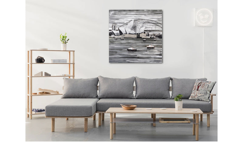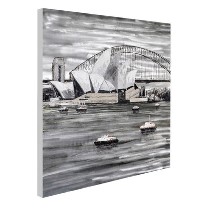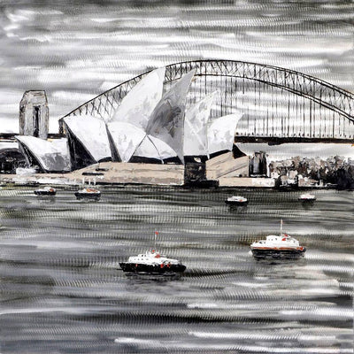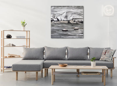 This mind-blowing landscape city art painting is showcasing the marvelous architectural wonder of Opera House in Sydney. By displaying great detail, boats and the striking Royal Opera House Bridge you'll feel like you are really there even though you are viewing a black and white hand painted canvas.