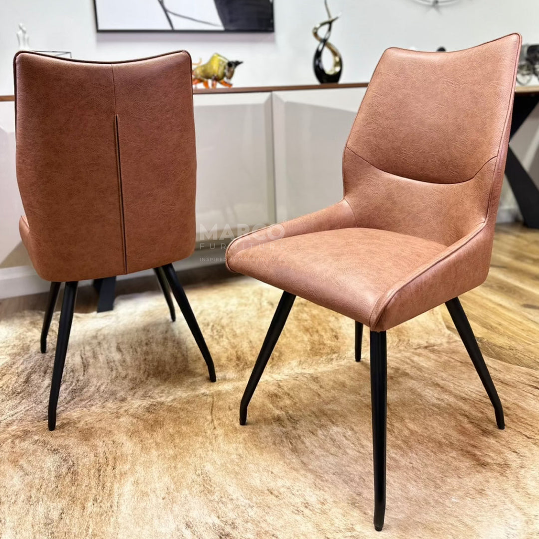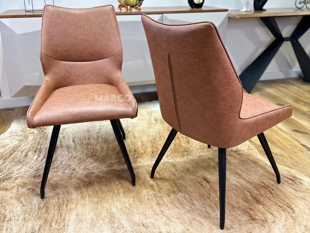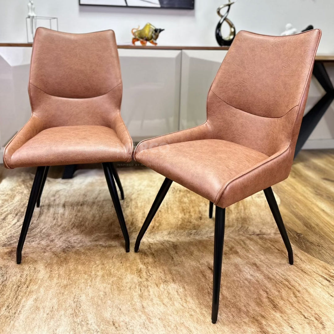 The Oz Tan Leather Dining Chair features a mid-century modern design with a curved structure. This high-back dining chair is upholstered in tan faux leather. The tan seat contrasts beautifully with black metal legs, making this modern dining chair a functional addition to contemporary dining rooms.