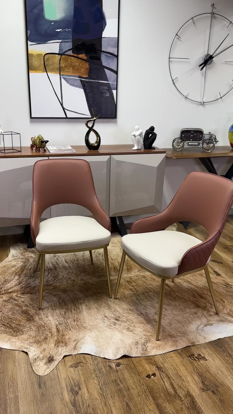 The Prada Curved Back Dining Chair, lends coastal vibes to modern dining spaces with its neutral tones and clean design. This highly durable dining chair is made from faux leather upholstery with a soft mocha tone rhombus quilted backrest contrasted with a white seat.This high-back dining chair is supported by firm, powder-coated metal legs painted gold.