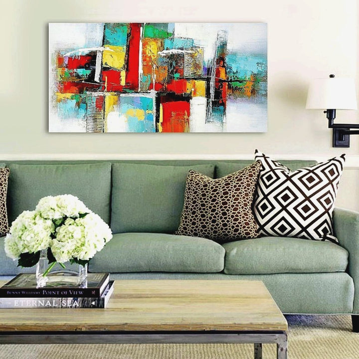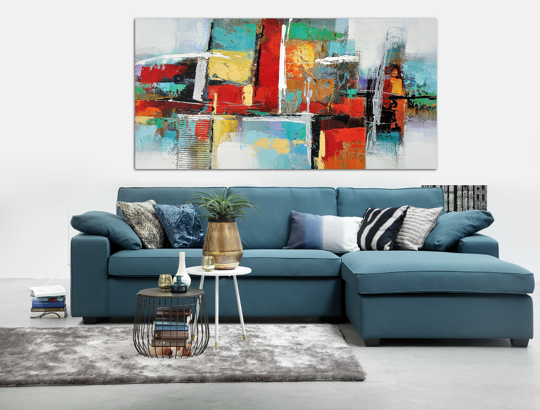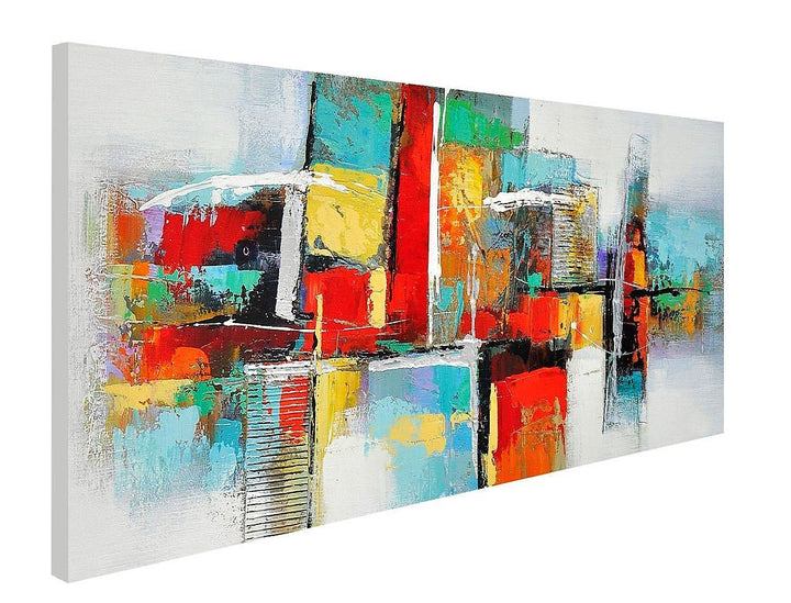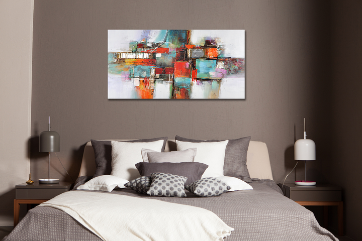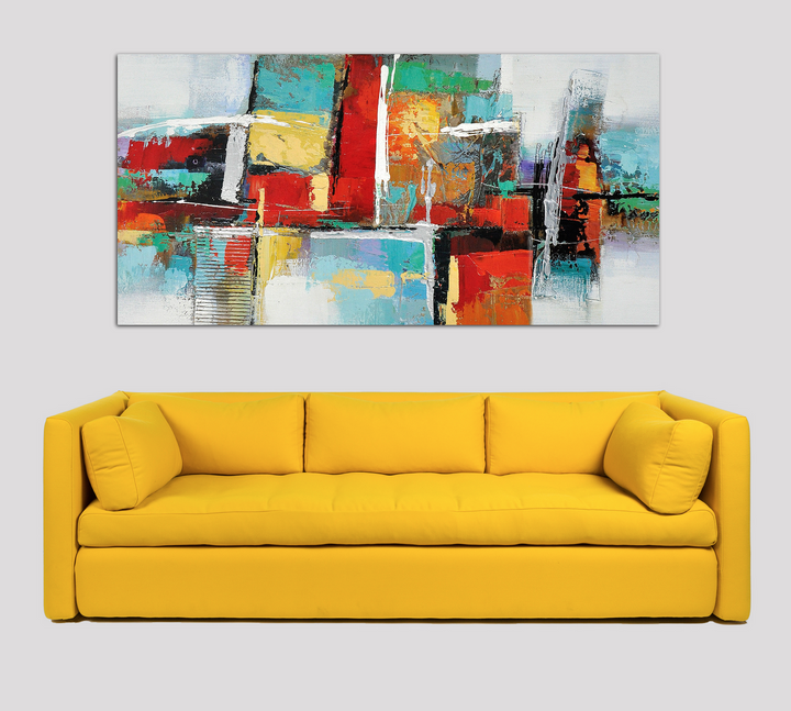 A wonderful and vibrant work of abstraction. Reflecting a form of a stack filled with gifts, this art piece contributes to the abstract visual language in a bright and vivid way. Symmetry and play of shapes that amazes.
