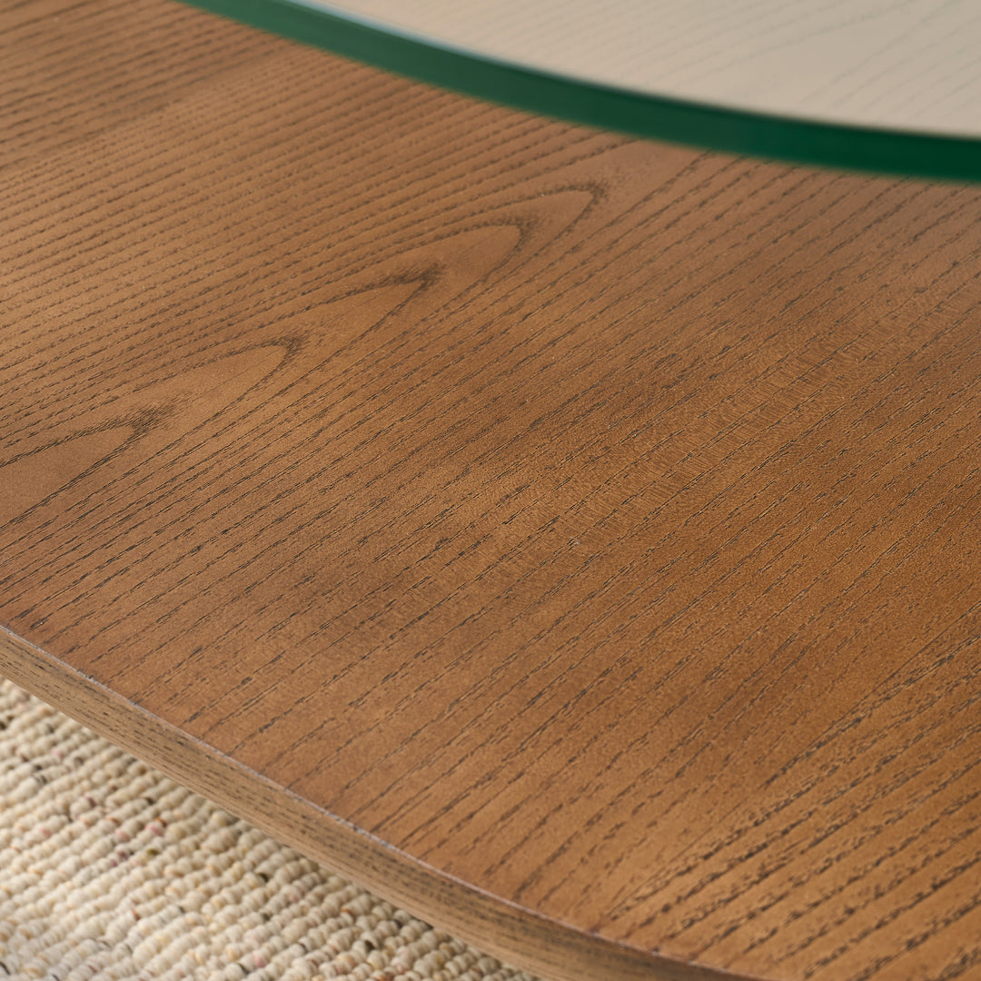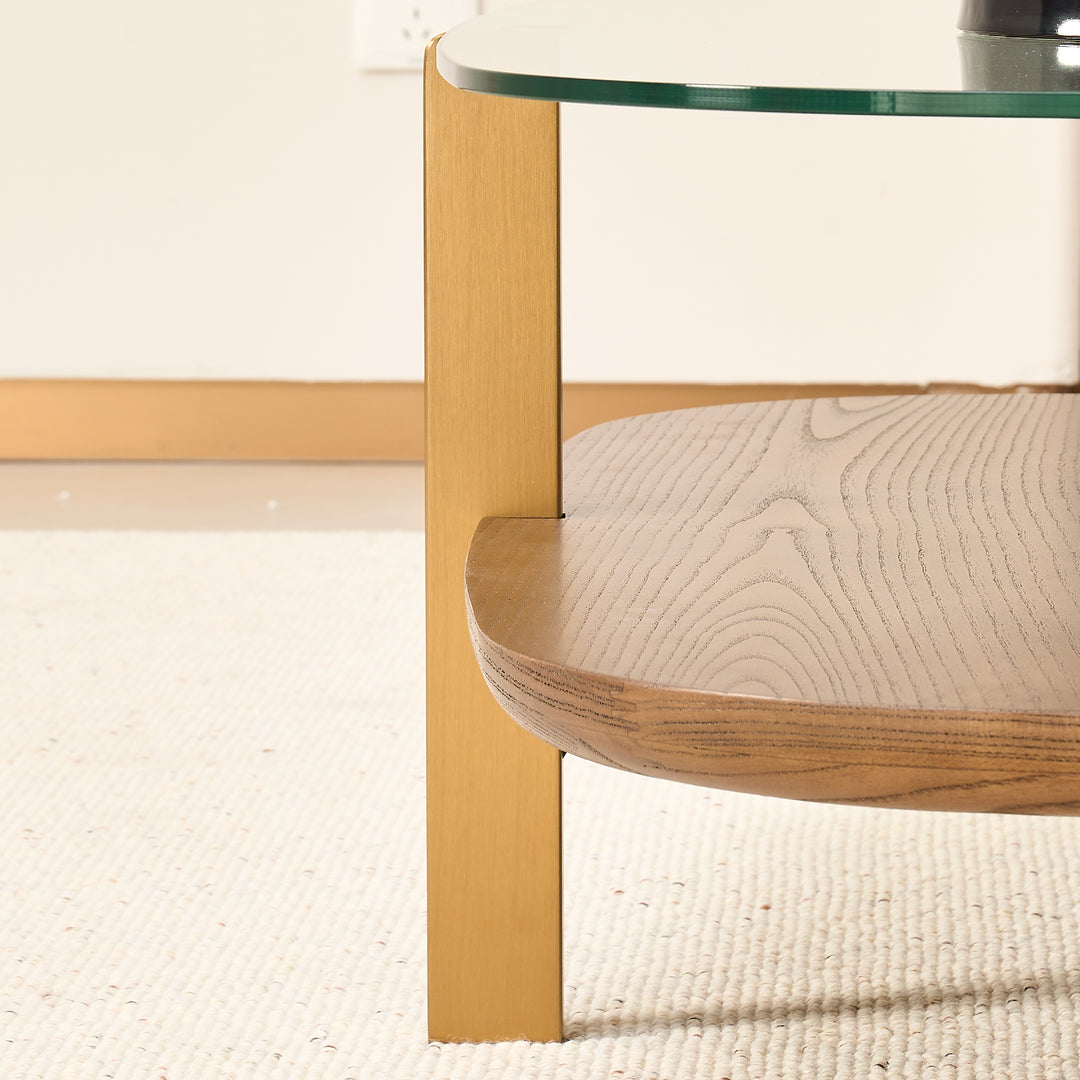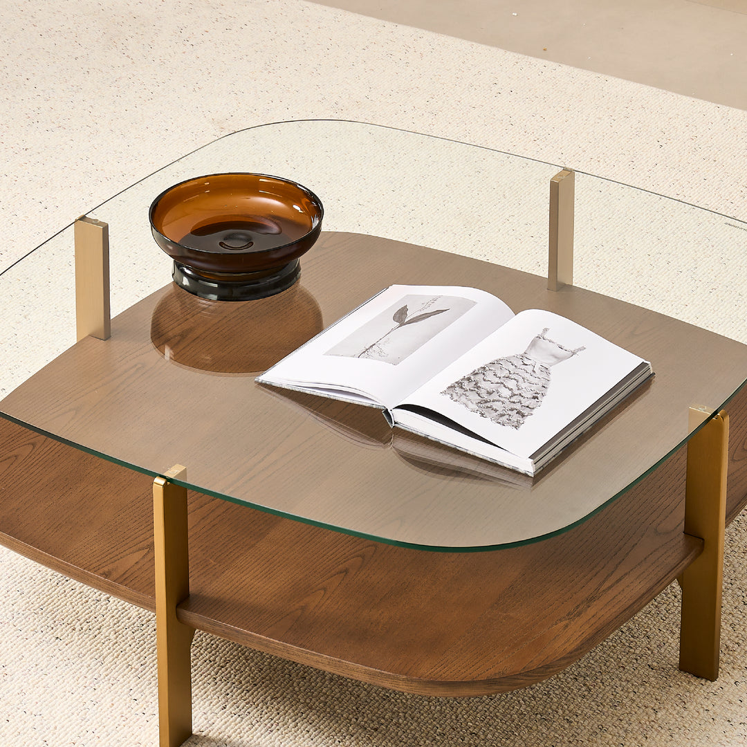 The Roma Glass Top Coffee Table showcases a mid-century design with a modern twist. Its tempered glass top provides an ideal display space for vases and sculptures, while the lower natural ash veneer section adds rustic charm to it. Sturdy brushed gold stainless steel legs complete the look, bringing refined visuals to this modern coffee table.