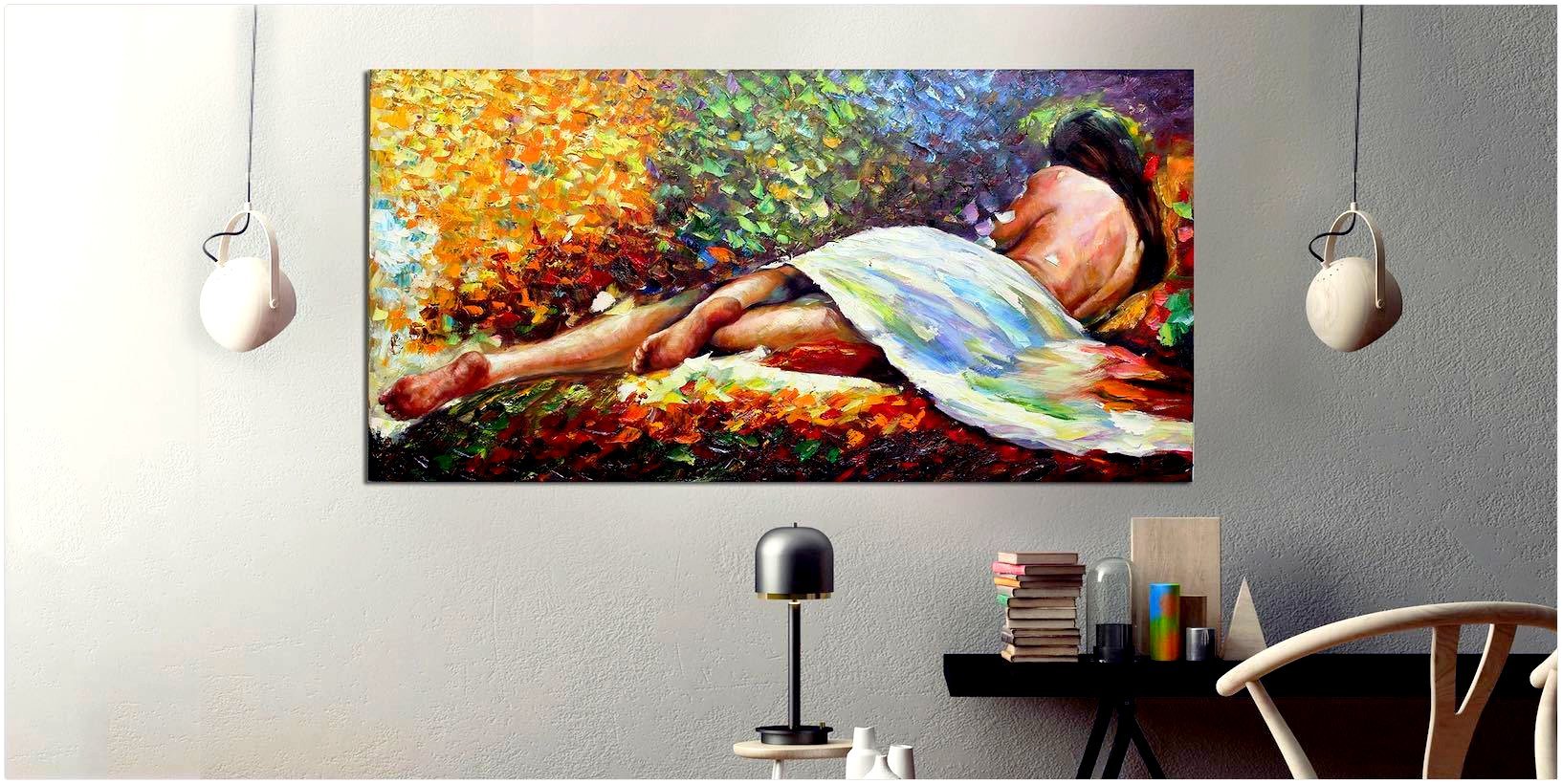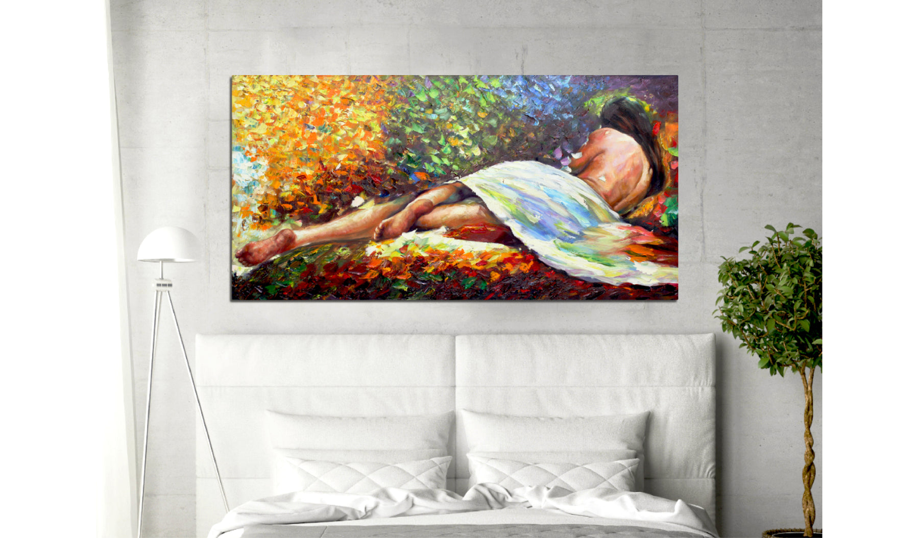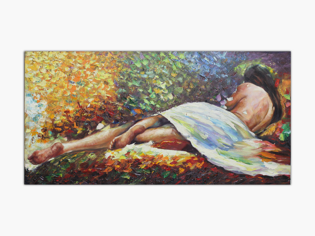 Glorious representation of the beauty of the woman true figurative art. The dreamy hue of warm colors is contrasted by the astounding beauty of the women's body.