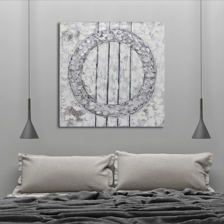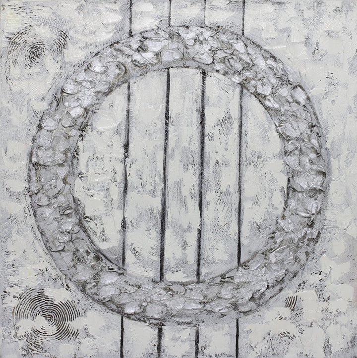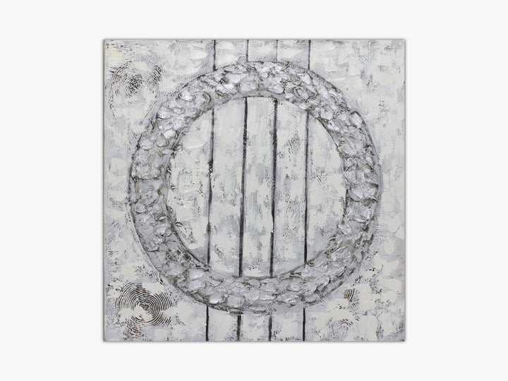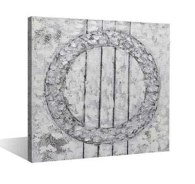 An abstract painting that expresses the meaning of life in an innovative way. The circle of life, masterfully sits on a piece of wood. Almost colorless, the painting is still amazing for urban & modern settings.