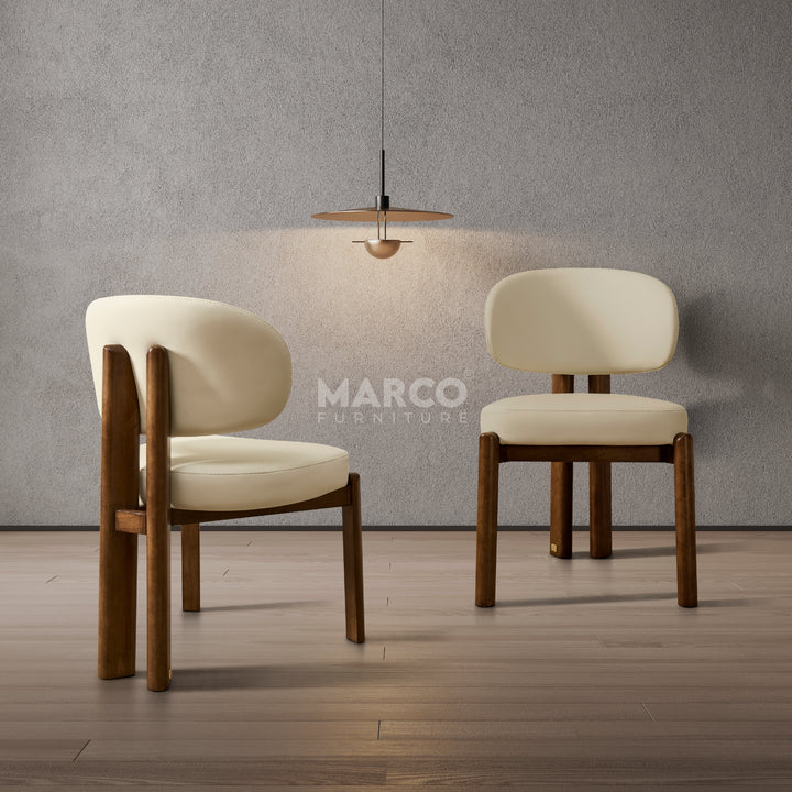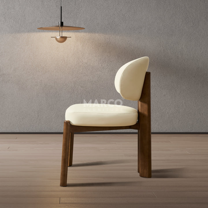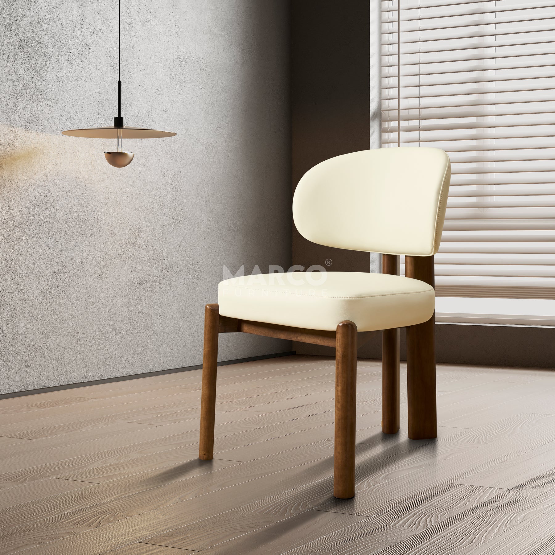 The Sofie Leather Dining Chair with Wooden Legs features a comfortable backrest and an armless design with a cocooning shape that gently cradles you. Upholstered in cream-white faux leather, this curved back dining chair ensures a cozy seating experience. The rounded wooden legs, finished in rich walnut, provide sturdy support while complementing its minimalist design for a clean dining room look.