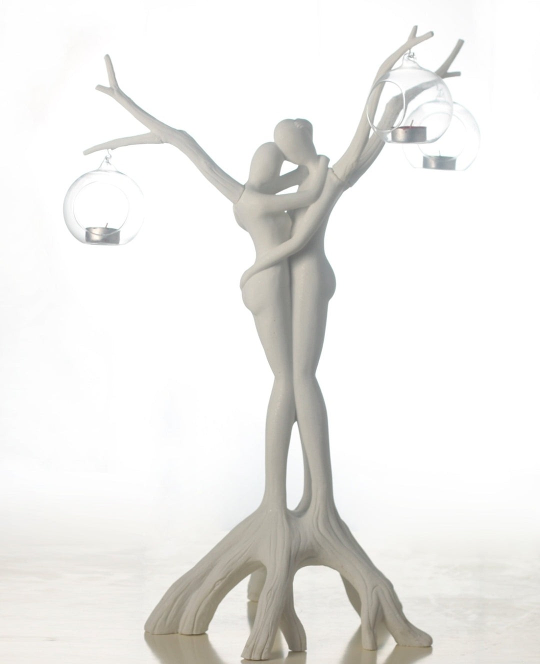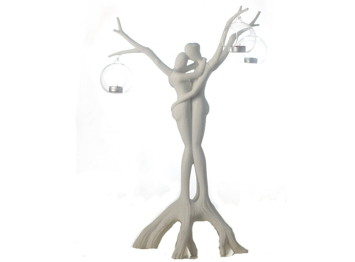 The Soulmates Figurine features an imaginative design with detailed artwork that enhances home decor. This table centerpiece showcases two intertwined human figures made from white poly resin, transitioning beautifully into tree branches and roots. The transparent glass orbs, hanging with the branches are ideal for tea light. This attractive sculpture is suitable for home, office and studio decoration.