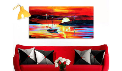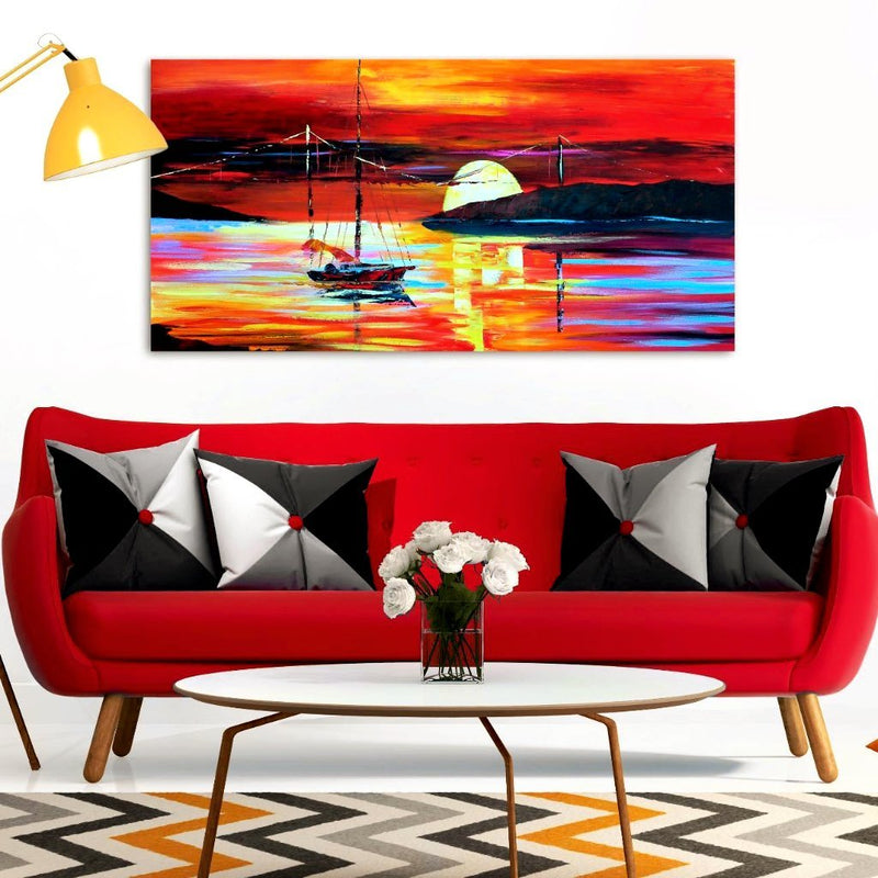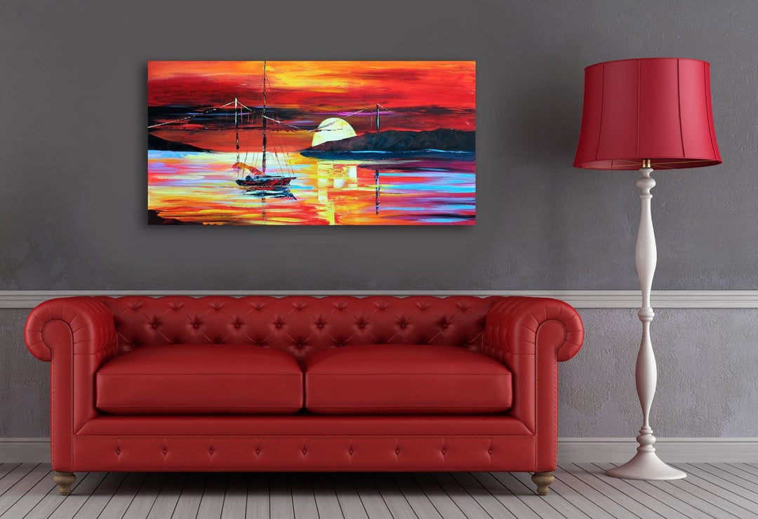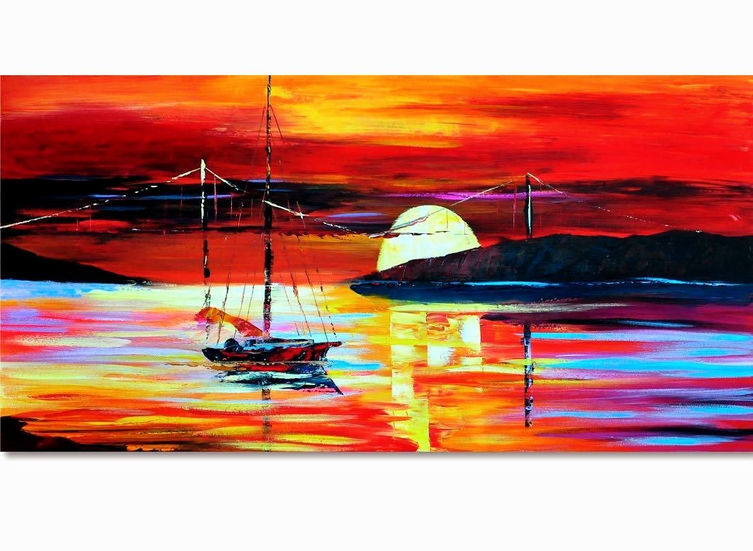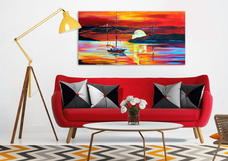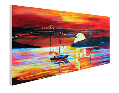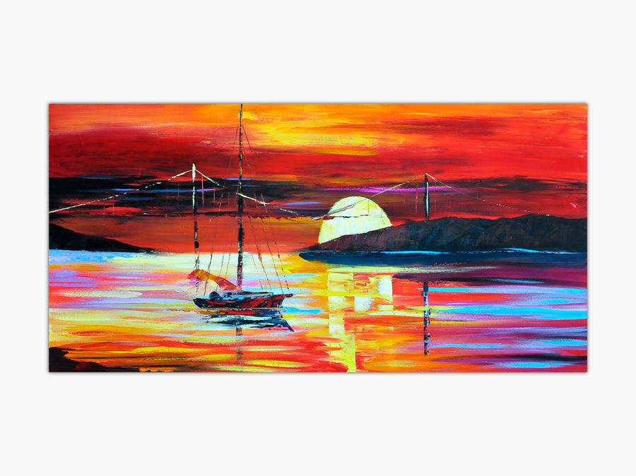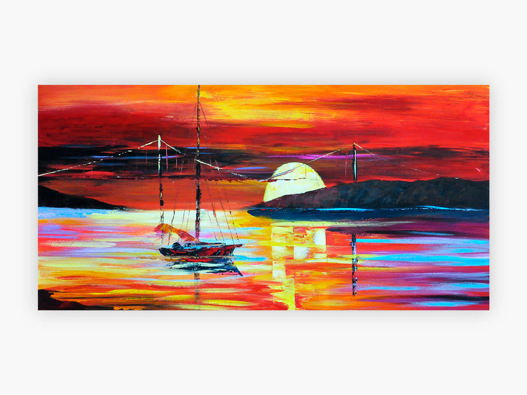 Blood Skyline features Inspiring sunset and skyline that look jaw-dropping like in real life. The yellow & red skyline is impressively reflected in the ocean. Fine art landscape painting for the lovers of nature.