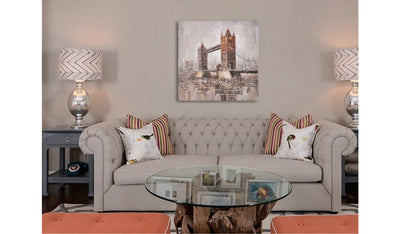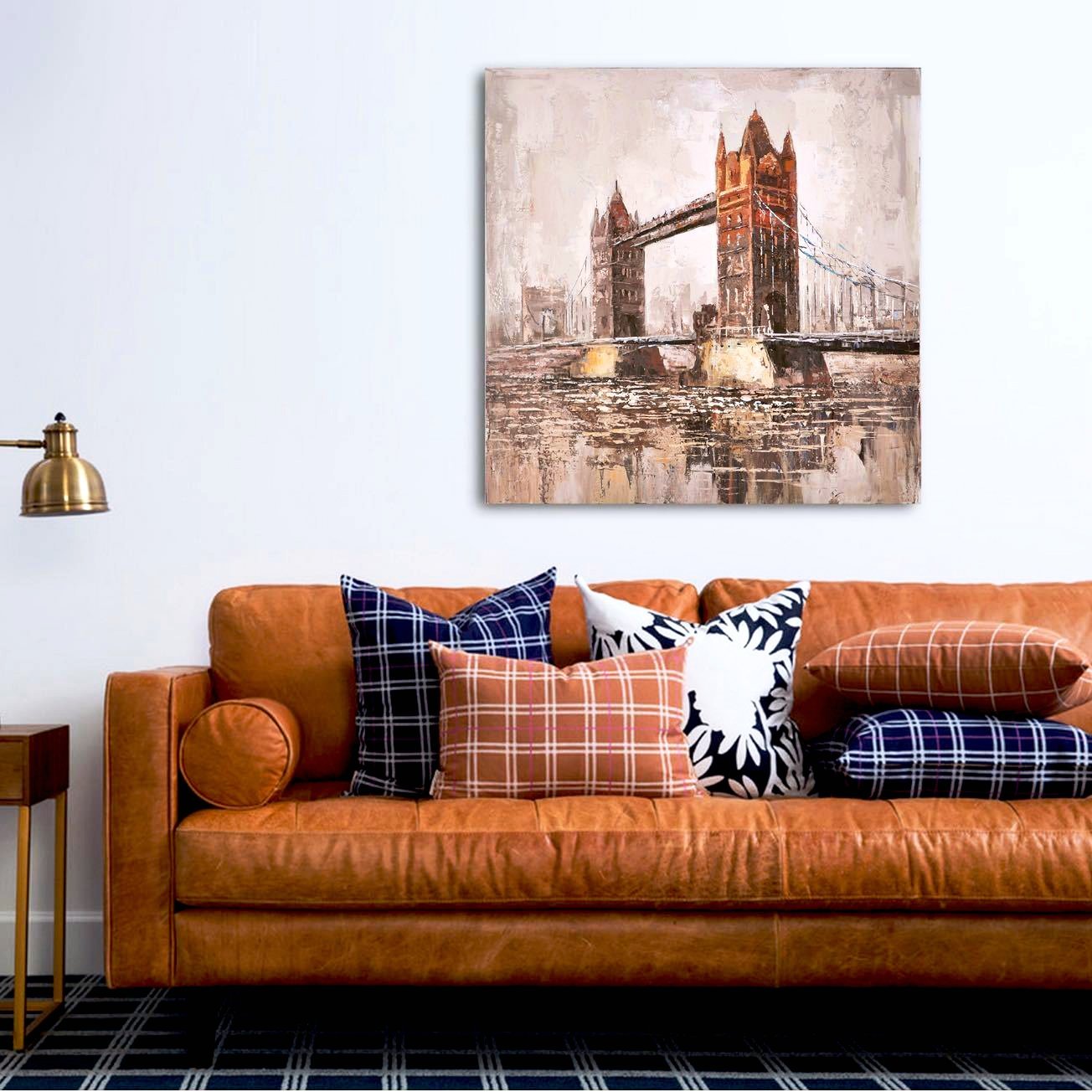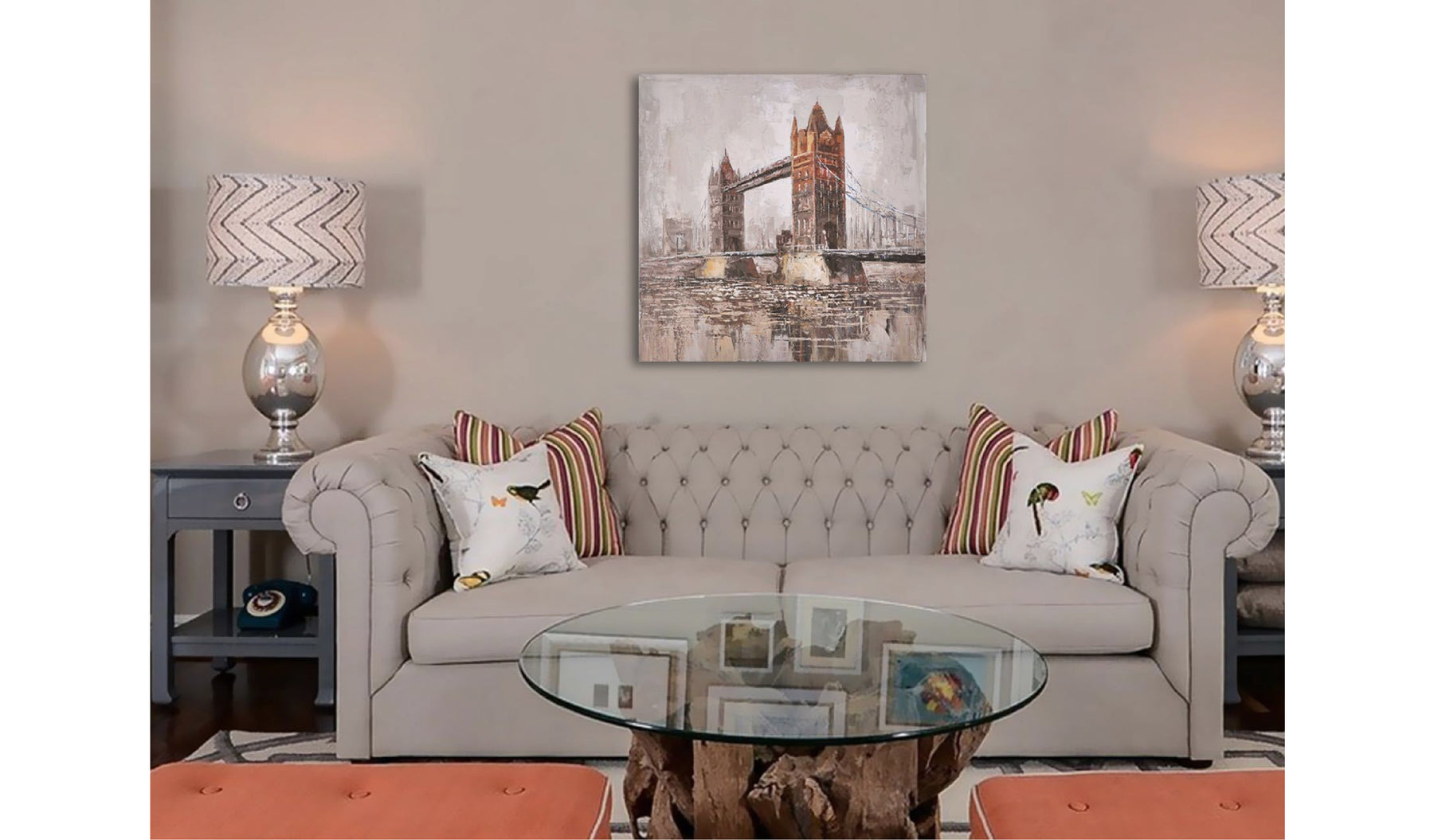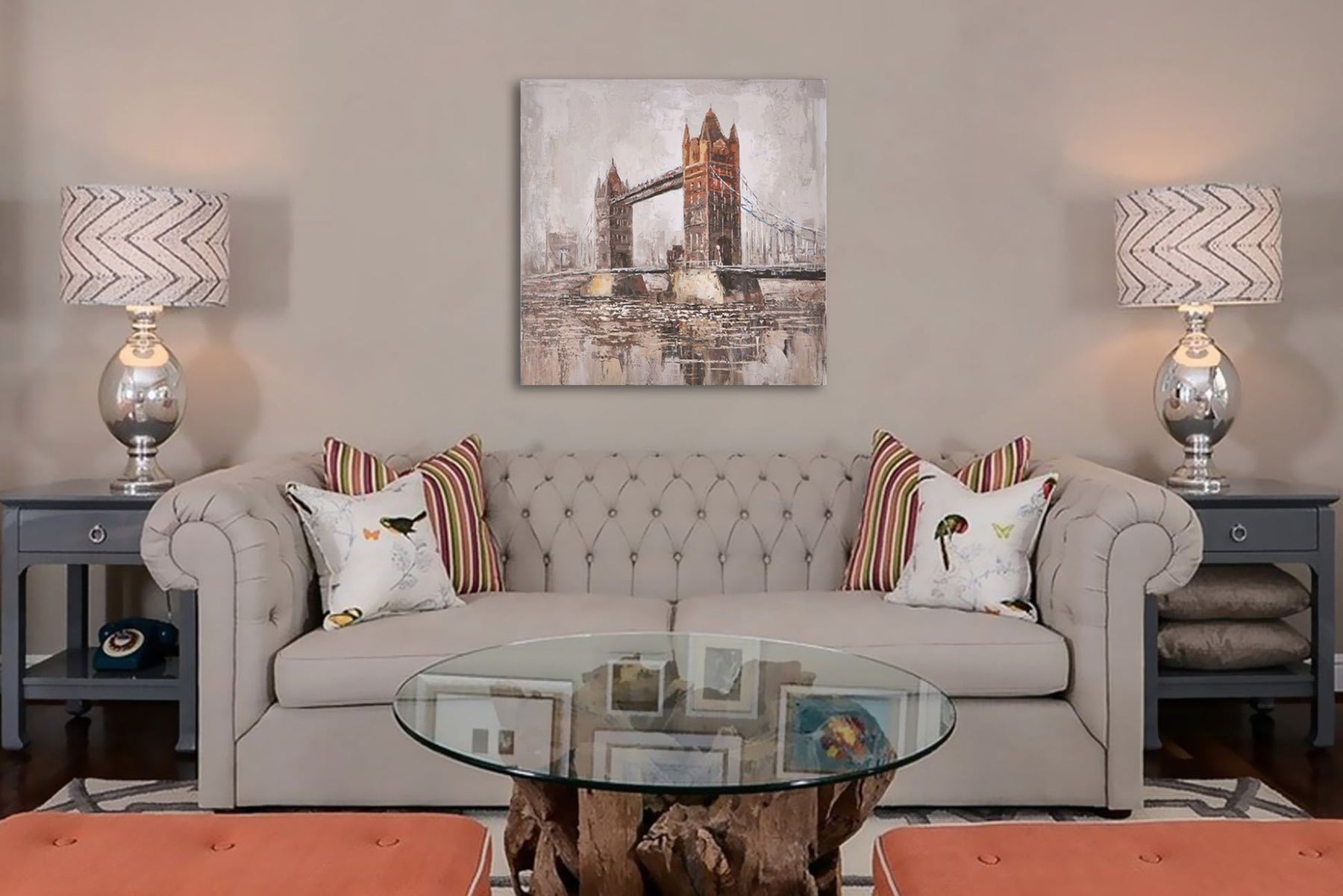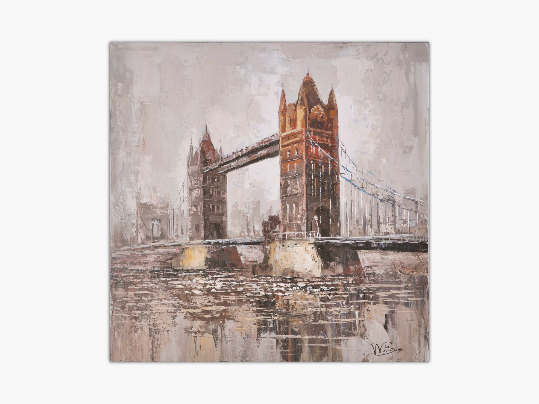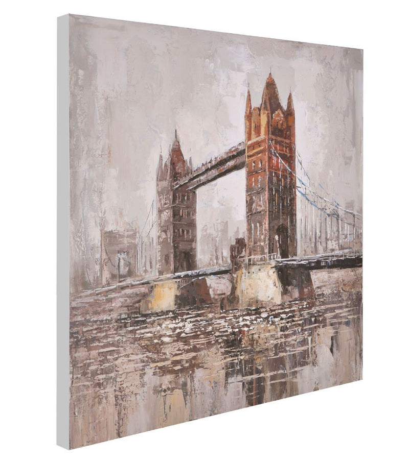 Breathtaking landscape with a enormous bridge with two towers. With thick color layering and skillful use of shadows, the bridge is masterfully put in focus. Urban art piece that will add sophistication and artistic character to your home or office.