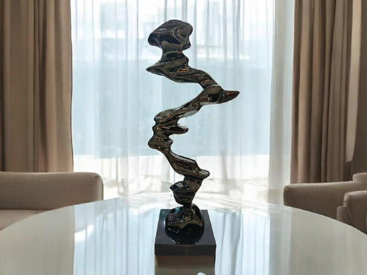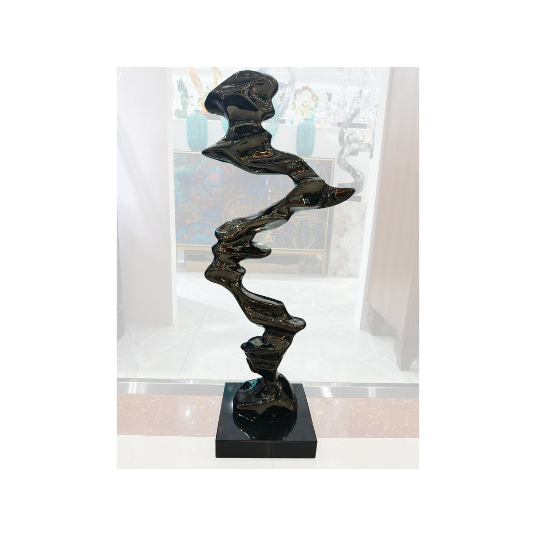 The Twisting Flow Sculpture is an artistic representation of a cascading figure. The use of high-quality metal gives this glossy black-finished sculpture durability, making it a lasting piece for the living room or hallway.