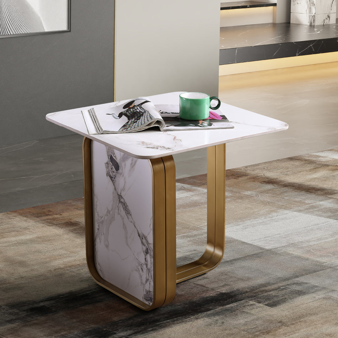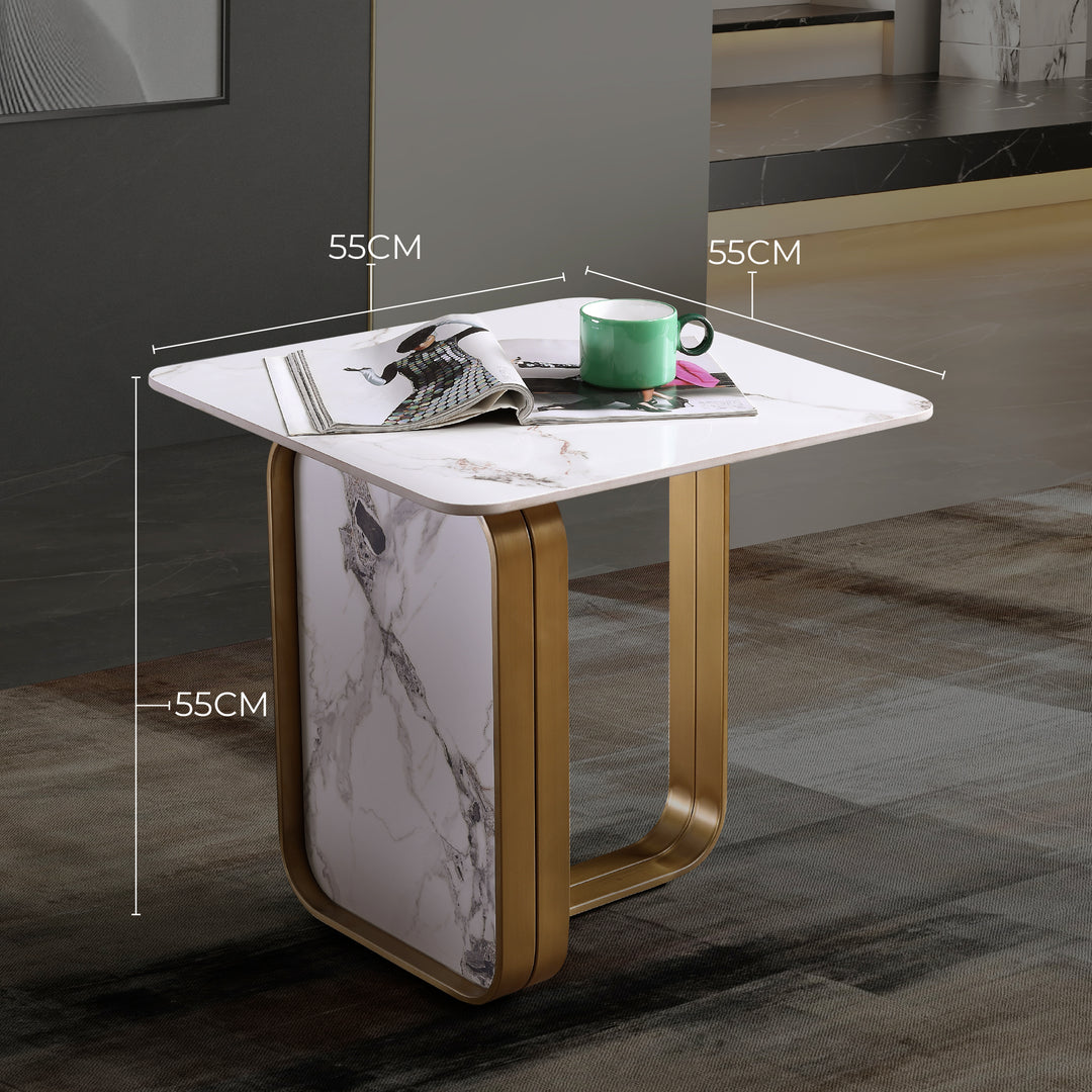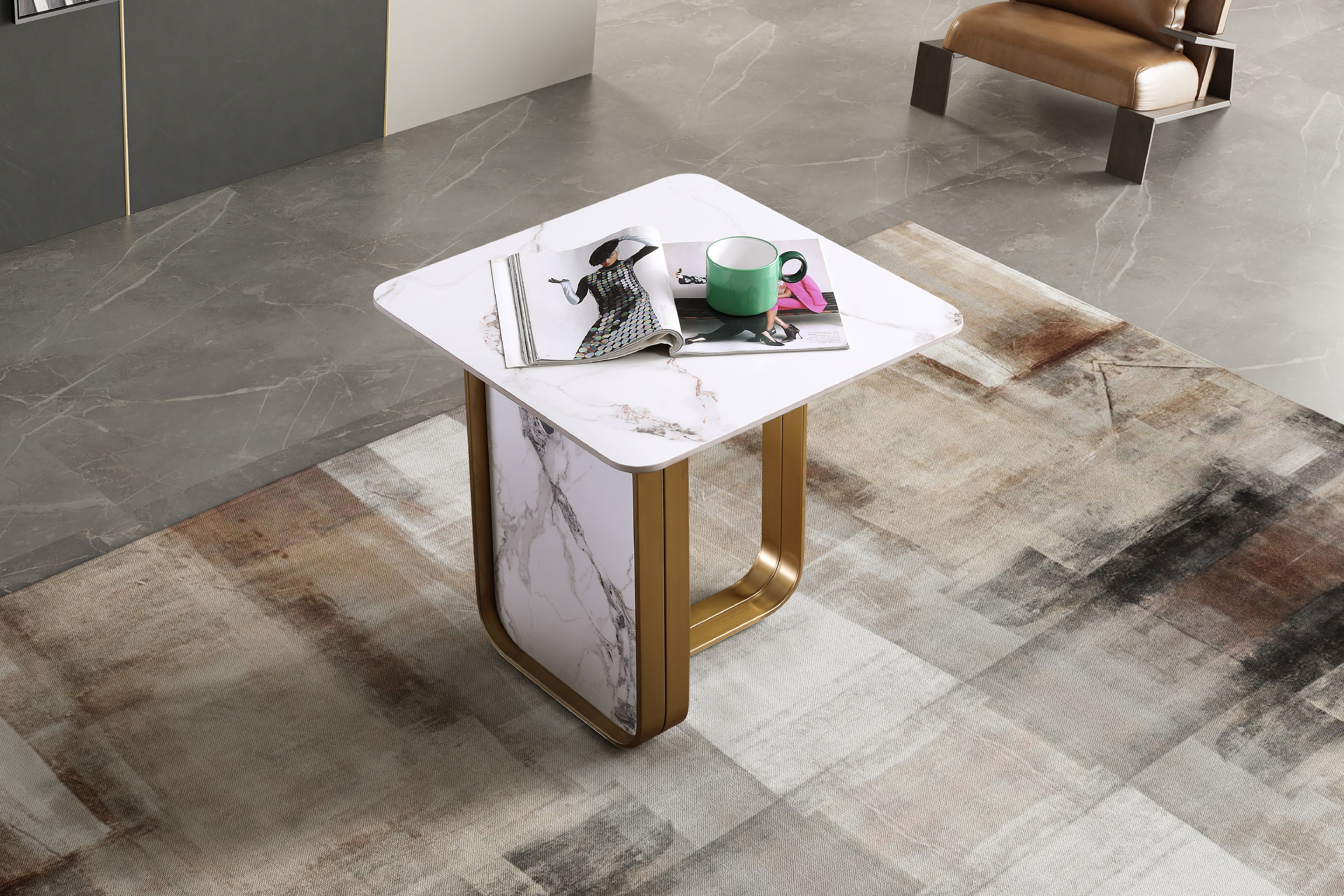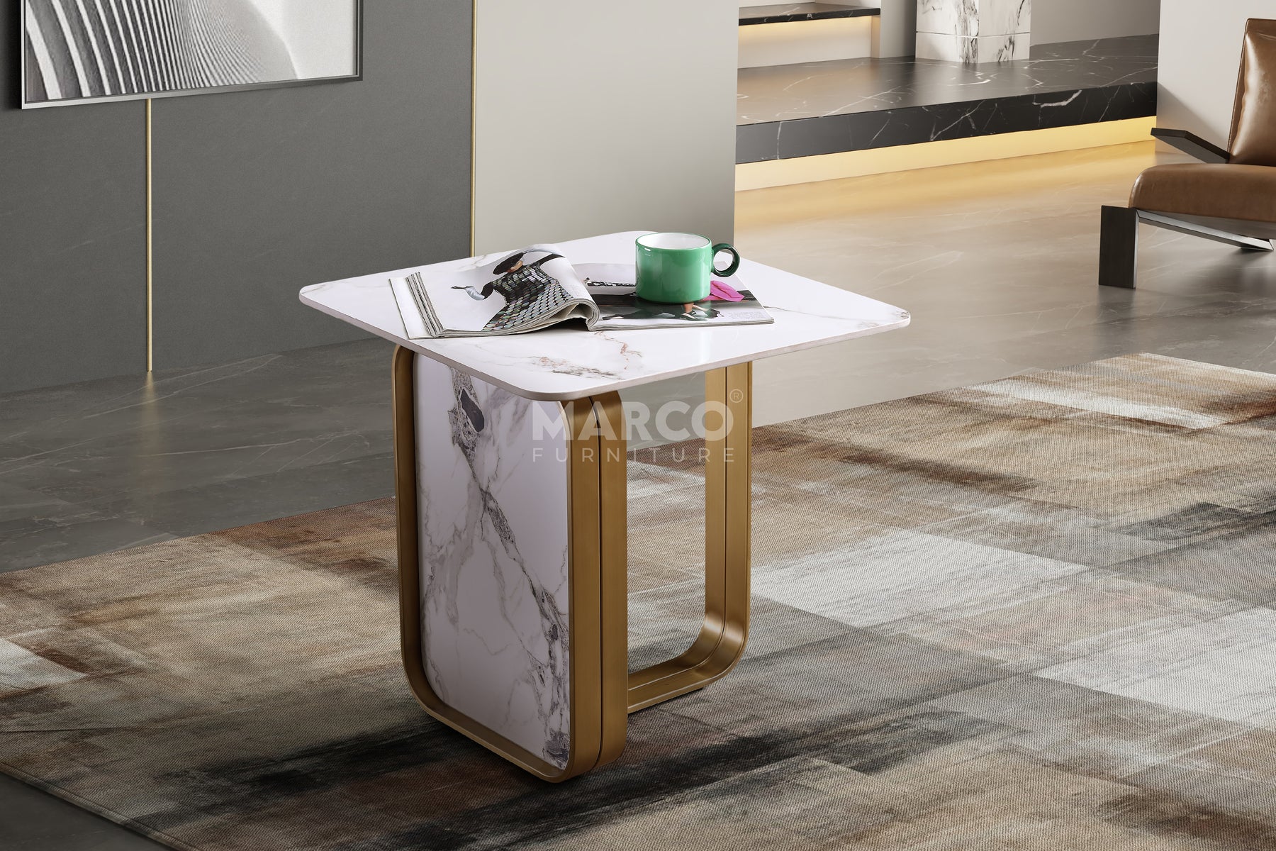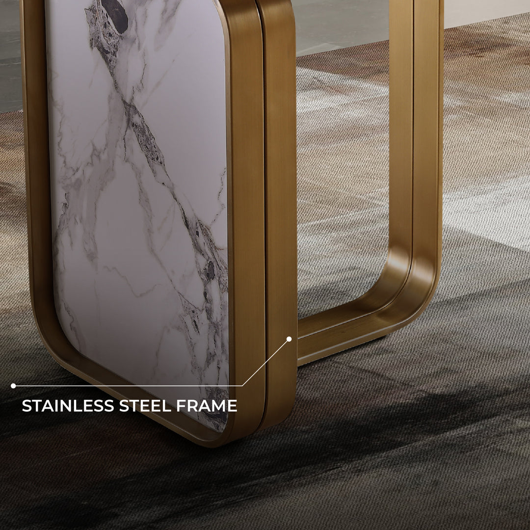 Vittoria side table is defined by its crisp profile and tactile contrast. Its top features white sintered stone, a high-performance material with superior resistance to heat, scratches, and stains. It’s a surface made to withstand daily use without compromising its visual integrity. Anchoring the piece is a precision-crafted stainless steel frame, lending both structure and a subtle industrial edge. A vertically mounted sintered stone panel echoes the tabletop, creating a balanced composition that feels both sculptural and grounded. Whether used in a living room, office, or bedroom, this corner table serves as both a stylish accent and a reliable addition to any space.